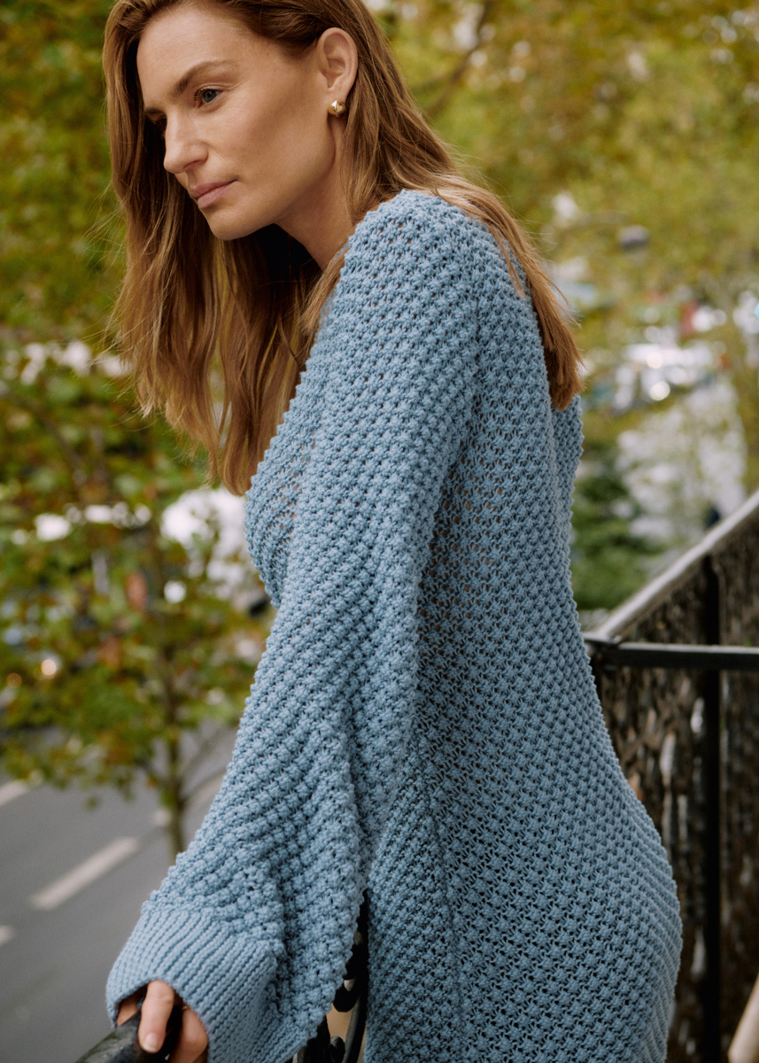 Lana Grossa-Qualität „Dodici“ (65 % Baumwolle, 25 % Viskose, 10 % Leinen, LL = ca 110 m/50 g): ca 600 (650 - 700 - 750) g Graublau (Fb 11); Stricknadeln Nr 3 und 5; 1 kurze Rundstricknadel Nr 3.