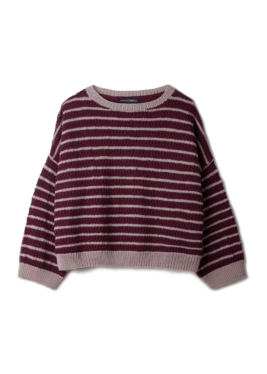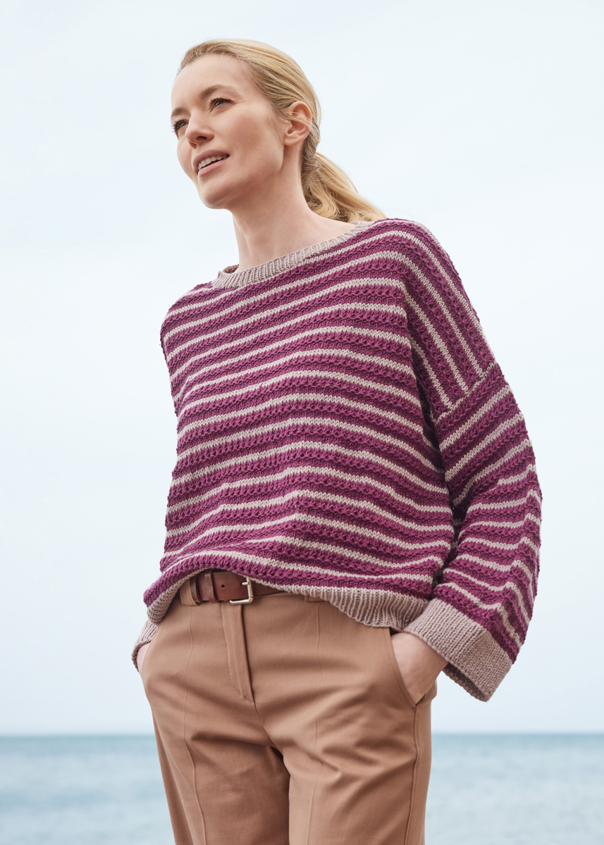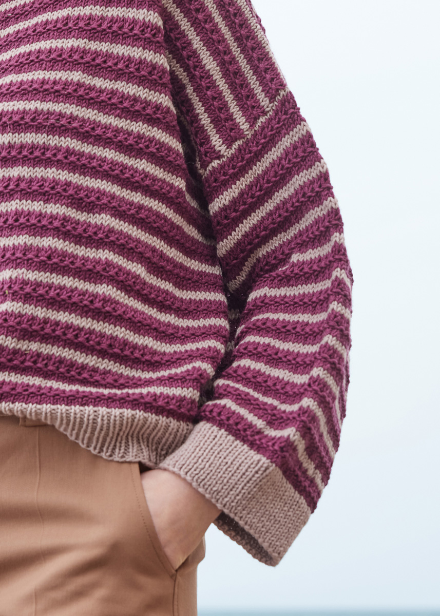 Siehe Variante 1, jedoch anstatt in Birkengrün 400 (400 - 450 - 450) g in Dunklem Burgund (Fb 1035), anstatt in Grége 250 (250 - 300 - 300) g in Graurosa (Fb 1033) verwenden.