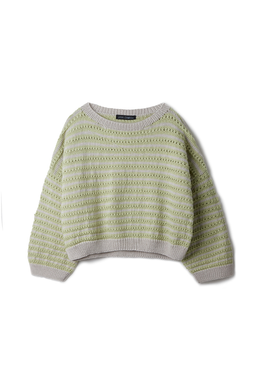 Lana Grossa Cool Wool Big (100 % Schurwolle (Merino), LL = ca 120 m/50 g), 400 (400 - 450 - 450) g in Birkengrün (Fb 1029) und 250 (250 - 300 - 300) g in Grège (Fb 1010).