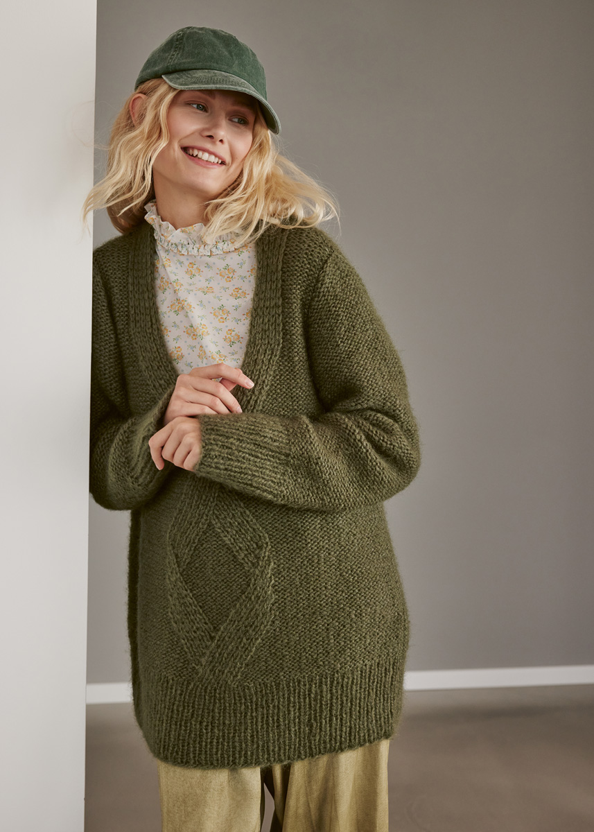 Lana Grossa Mohair Di Gio (55 % Mohair (Superkid), 45 % Schurwolle (Merino superfine), Lauflänge = 85 m/50 g): 500 (550 / 600 / 650) g Farngrün (Fb. 14); je eine Rundstricknadel 5 mm und 7 mm, 80 – 100 cm lang (Rd mit geringerem Umfang mit der Magic-Loop-Methode oder einer zusätzlichen kurzen Rundstricknadel 5 mm arbeiten); Zopfnadel.