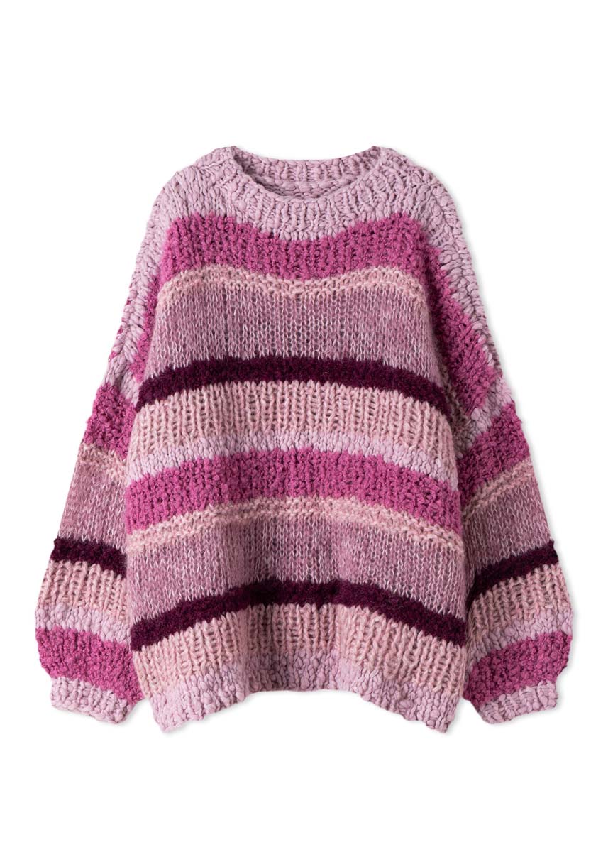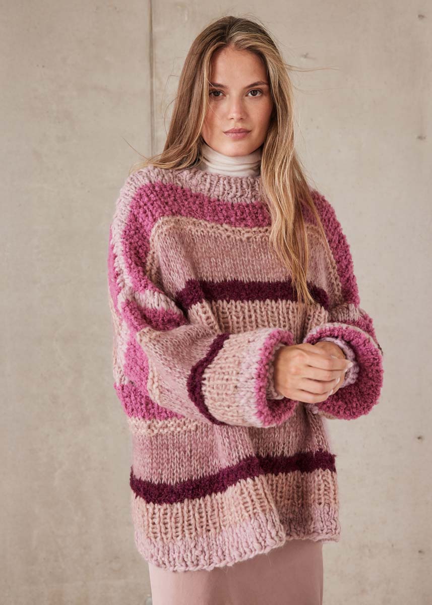 Urgemütlich und schnell gestrickt: Der großzügige SWEATER mit Streifen im Muster- und Materialmix (zwei neue Qualitäten plus Silkhair und Alpaca Air II).