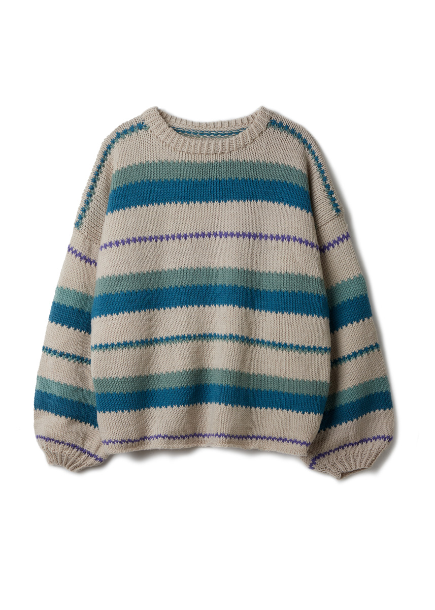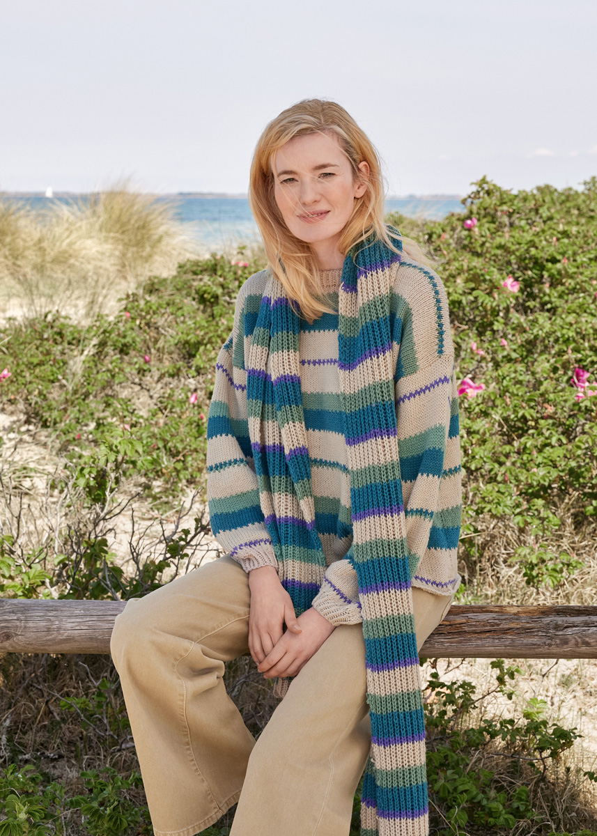 Lana Grossa Merino Uno (100 % Schurwolle (Merino), LL = ca 125 m/50 g), 300 (350 - 350 - 400) g in Grège (Fb 55), 100 (100 - 150 - 150) g in Petrol (Fb 60), 100 (100 - 100 - 150) g in Resedagrün (Fb 34), 50 g in Violett (Fb 86). Stricknadeln Nr 4,5 und Nr 5 sowie eine 50 cm lange Rundstricknadel Nr 4,5.