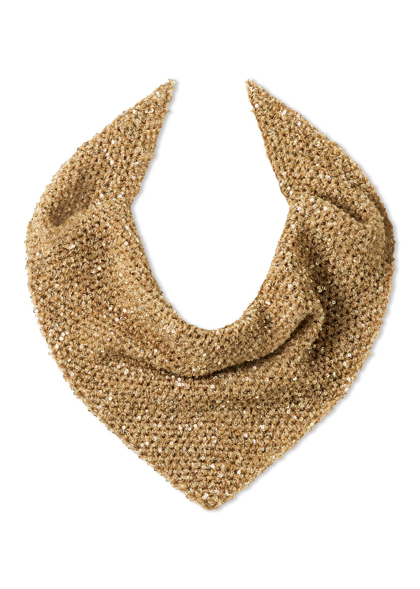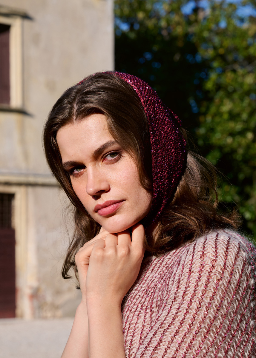 Lana Grossa-Qualität „Glamour“ (55 % Polyamid, 45 % Polyester, LL = ca 115 m/25 g): ca 75 g Bordeaux (Fb 9) oder Beige (Fb 10) oder Goldgelb (Fb 18); Häkelnadel Nr 3,5.