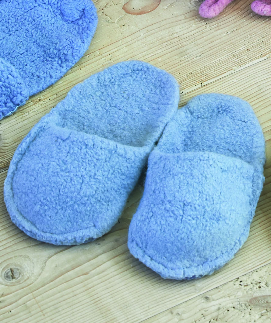 Lana Grossa Qualität „Feltro“ (100 % Schurwolle,LL = 50 m/50 g), Gr. 40–45 je 200 g, Gr. 34–39 je 150 g: Farben von links nach rechts: Himmelblau (Fb. 65), Hellblau (Fb. 66), Mint (Fb. 67), Erika (Fb. 69); Stricknadeln Nr. 8; Häkelnadel Nr. 8.