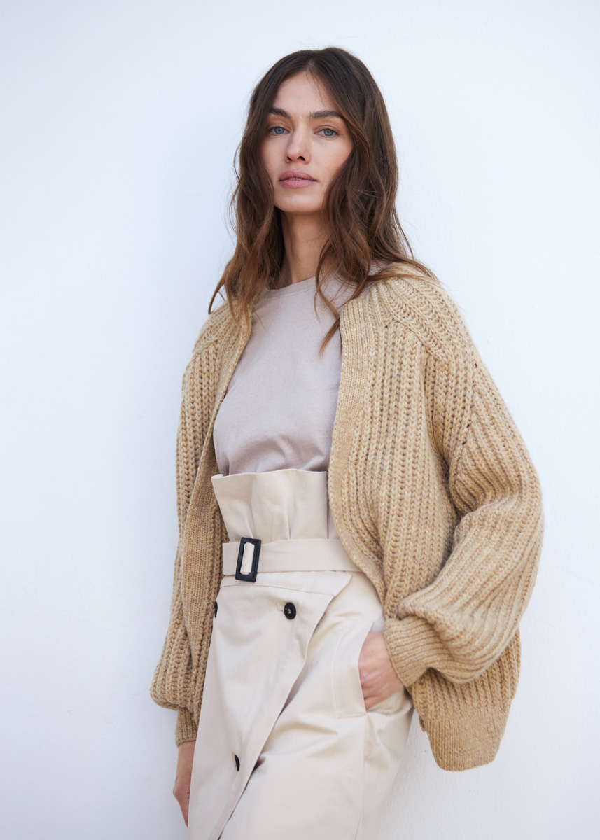 Lana Grossa-Qualität „Cool Merino Big“ (90 % Schurwolle (Merino), 10 % Polyamid, LL = ca 90 m/50 g): ca 600 (650 - 650 - 700) g Beige (Fb 223); Lana Grossa-Qualität „Cool Merino“ (90 % Schurwolle (Merino), 10 % Polyamid, LL = ca 150 m/50 g): ca 200 (250 - 250 - 300) g Hellbeige (Fb 23); Stricknadeln Nr 3,5 + Nr 5.