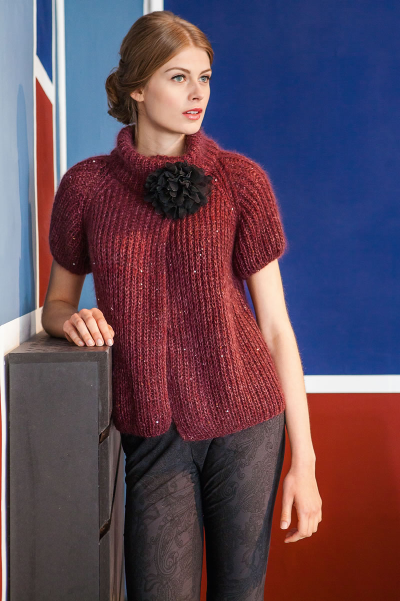 Lana Grossa „Lace Paillettes” (45% Alpaka, 20% Schurwolle, 15% Baumwolle, 15% Polyamid, LL = 150 m/25 g) 150 g Burgund (Fb 4), “Tiffany” (64% Mohair, 26% Seide, 10% Polyamid, LL = 110 m/25) 200 g Brombeer (Fb 6) Stricknadeln Nr. 5, eine Rundstricknadel Nr. 4,5, eine Häkelnadel Nr. 4, ein Pelzhaken (von Prym).