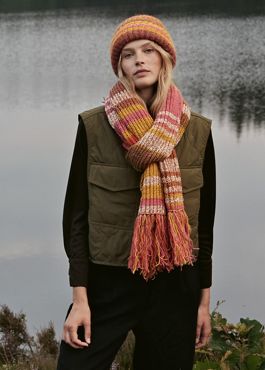 Lana Grossa-Qualität „Gomitolo Tosca“ (60 % Schurwolle, 40 % Polyacryl, LL = ca 700 m/200 g): 200 g Pink/Senfgelb/Violett/Brombeer/Rot (Fb 164) und „Cool Merino Print“ (90 % Schurwolle (Merino), 10 % Polyamid, LL = ca 150 m/50 g): ca 100 g Rohweiß/Flieder/Orange/Senf (Fb 106); Stricknadel Nr 4,5; Häkelnadel Nr 4.