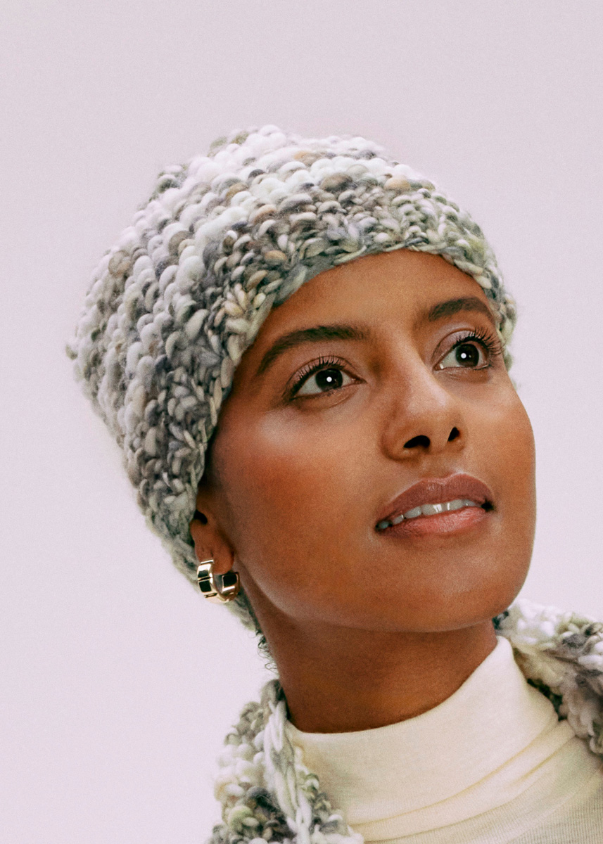 Lana Grossa-Qualität „Lala Berlin Flamy“ (100 % Schurwolle (Merino), LL = ca 70 m/100 g): ca 100 g Flieder (Fb 11) und ca 100 g Rosa (Fb 8) oder ca 100 g Rohweiß/Beige/Grau meliert (Fb 101) und ca 100 g Weiß (Fb 1); 1 kurze Rundstricknadel oder Nadelspiel Nr 7.