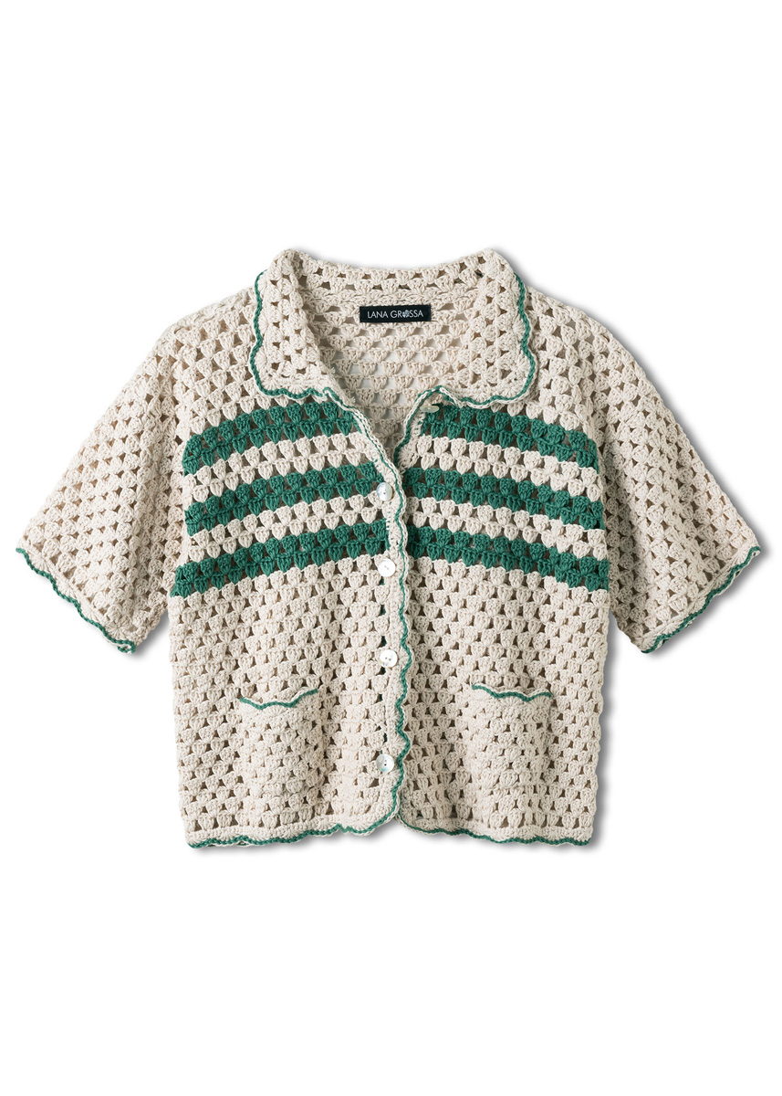 Lana Grossa-Qualität „Landlust Baumwolle” (100 % (Bio) Baumwolle, LL = ca. 115 m/50 g): ca. 400 (450) g Natur (Fb. 3) und ca. 50 g Smaragdgrün (Fb. 9); 1 Wollhäkelnadel Nr. 3,5; 5 Perlmuttknöpfe in Natur, ø 18 mm.