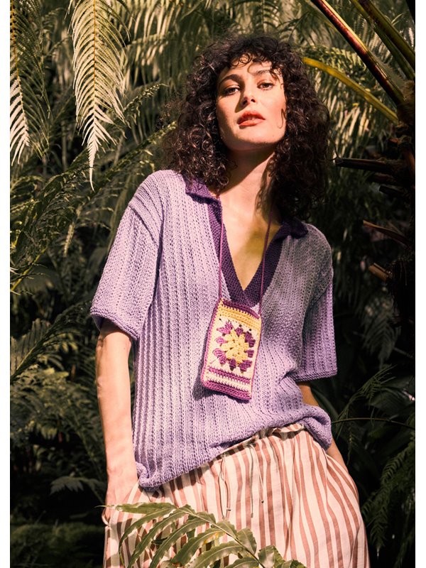 Lana Grossa, Qualität „Brigitte No. 4“ (80 % Baumwolle, 20 % Baby Alpaka, Lauflänge 110 m/50 g): 350 (350/400/450) g in Veilchenblau Nr. 36 und 50 g in Dunkelviolett Nr. 25. Stricknadeln 3,5 und 4,5.