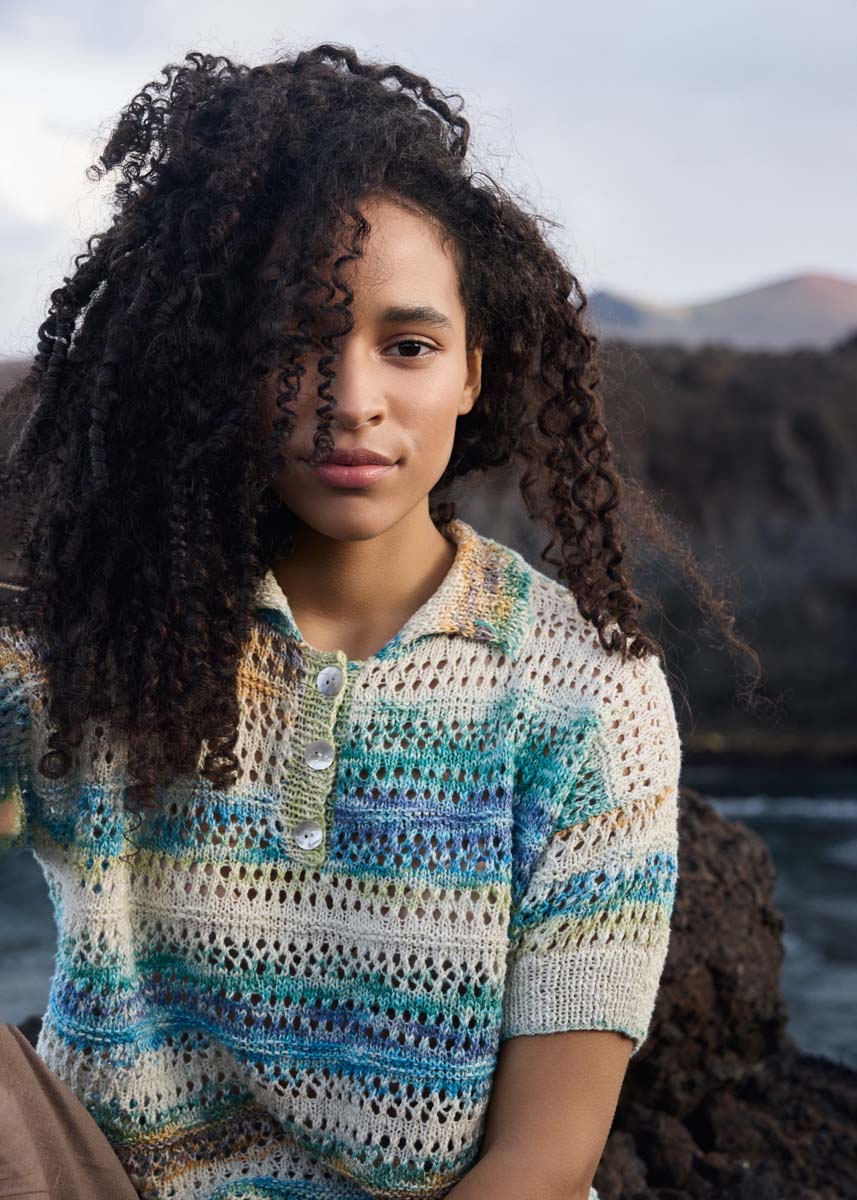 Lana Grossa-Qualität „Gomitolo Hippie“ (66 % Baumwolle, 30 % Hanf, 4 % Leinen, LL = ca 300 m/100 g): 3 (4 - 4 - 4 - 5) Knäuel = ca 300 (400 - 400 - 400 - 500) g Blaulila/Türkis/Natur/Moosgrün/Ocker/Dunkelgrau/Lindgrün (Fb 3033); Stricknadeln Nr 2,5 und Nr 3, 1 kurze Rundstricknadel Nr 2,5; 3 Perlmuttknöpfe mit 17 mm Durchmesser.