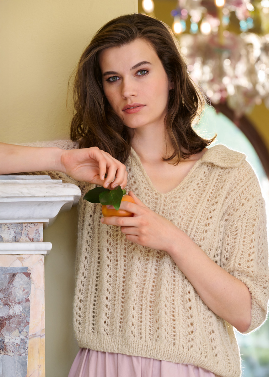 Miniperlen, Ajour-Strukturen und ein sportlicher Polokragen – ein perfekter Mix aus entspannt und chic. Unkompliziert: Der Ausschnitt des Shirts besteht aus einem einfachen Schlitz.