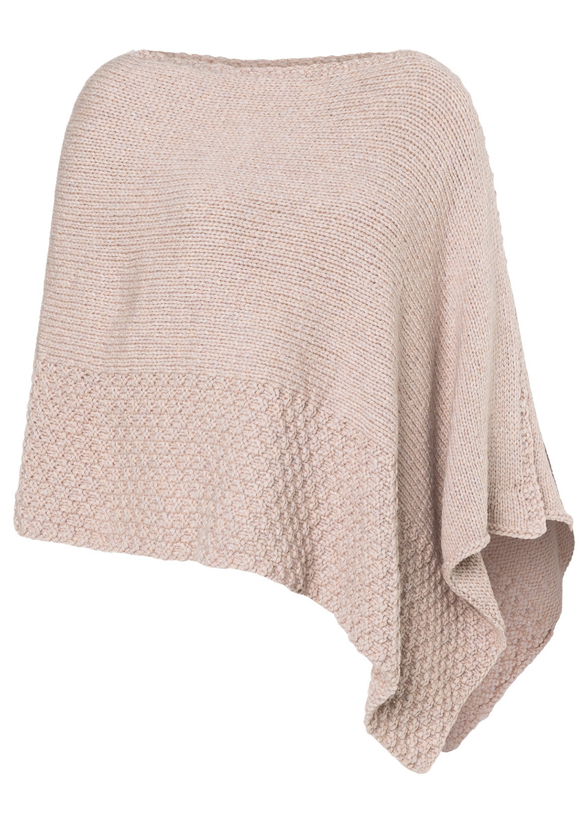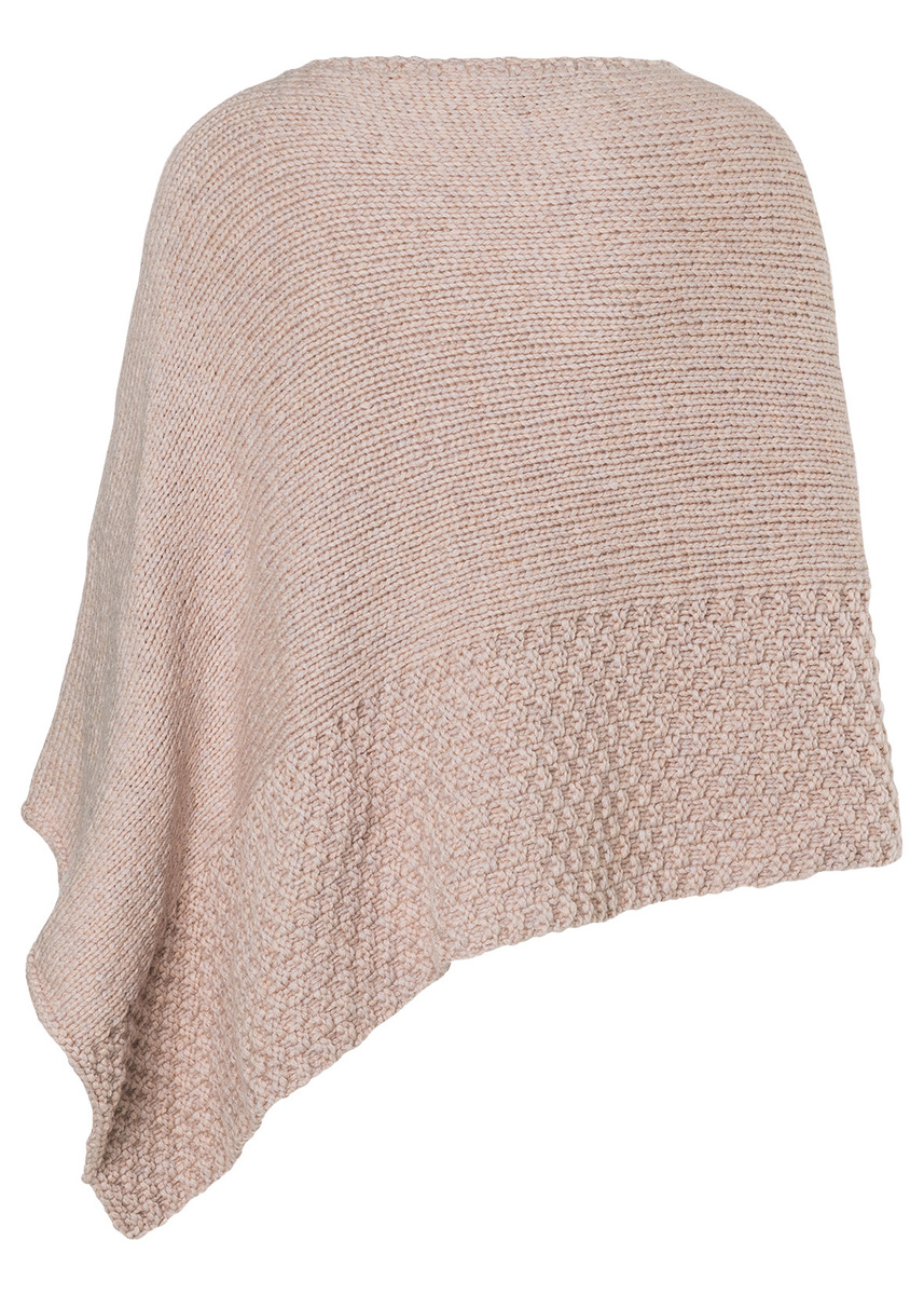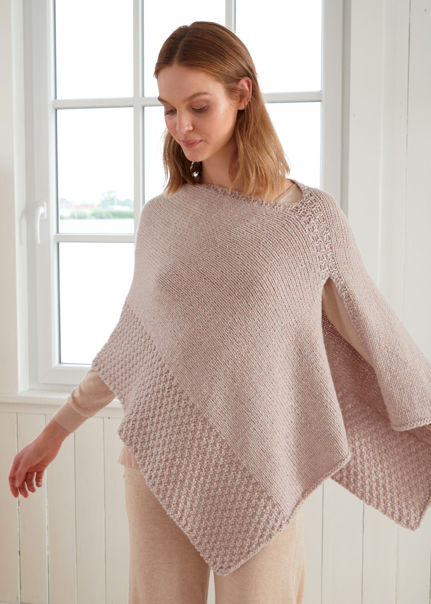 Für dieses Traumteil mit Rechts-Links-Musterblenden strickst du einfach ein großes Rechteck und faltest es in der Mitte zusammen. Danach die oberen Kanten, bis auf Ausschnitt und Schlitz, zusammennähen.