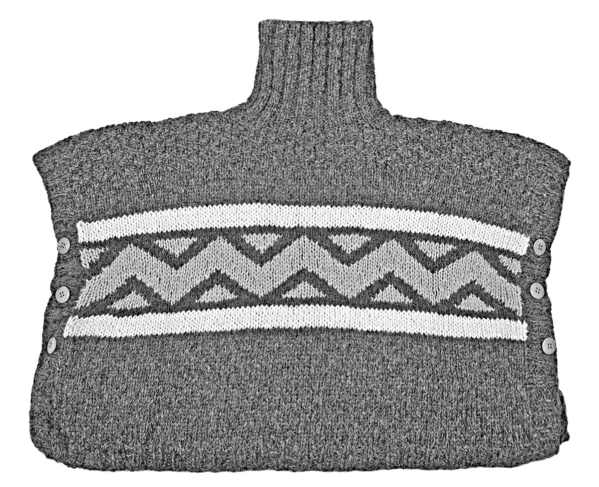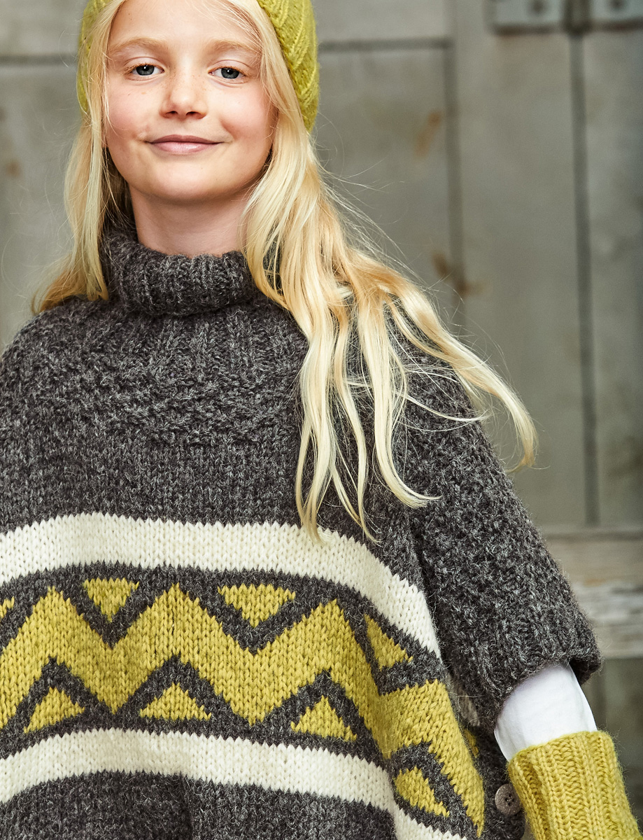 Lana Grossa Brigitte No. 2 (47 % Baby Alpaka, 45 % Baumwolle, 8 % Schurwolle Merino, Lauflänge 140 m/50 g), 250 (300) g Schiefer (Fb 24), 50 (100) g Grüngelb (Fb 17) und 50 g Rohweiß (Fb 16); Stricknadeln Nr. 7, 1 Rundstricknadel Nr. 6, 40 cm lang, 1 Rundstricknadel Nr. 7, 120 cm lang, 6 Knöpfe von UNION KNOPF, Art. 453382, Fb Grau, Gr. 22 mm.