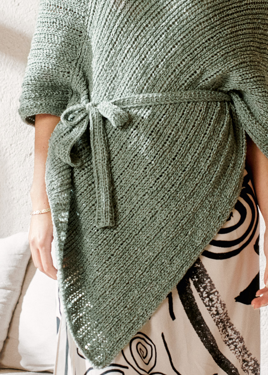 Ein großes und ein kleines Rechteck ergeben diesen asymmetrischen Poncho im einfachen Lochrippenmuster.