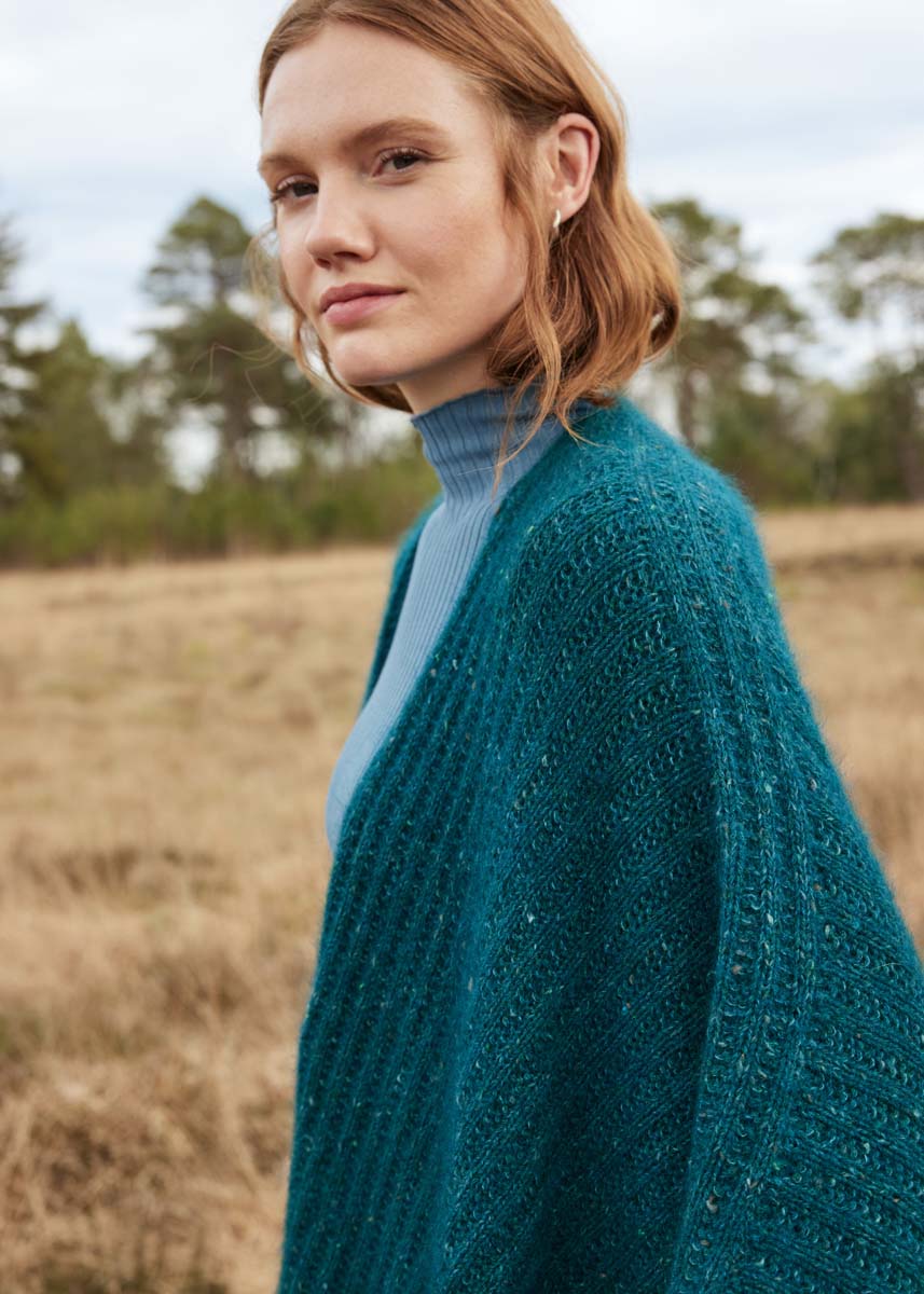 Lana Grossa Cashmere 16 Fine (80% Schurwolle (Merino extrafine), 10% Kaschmir, 10% Polyamid, Lauflänge 320 m/50 g), 350 g in Tiefseegrün (Fb. 66) und Lana Grossa Natural Superkid Tweed (60% Mohair (Superkid), 30% Seide, 7% Baumwolle, 3% Polyester, Lauflänge 200 m/25 g), 250 g in Tiefseegrün (Fb. 634); 1 Rundstricknadel Nr. 4,5, 120 cm lang, 1 Nadelspielnadel Nr. 4,5.