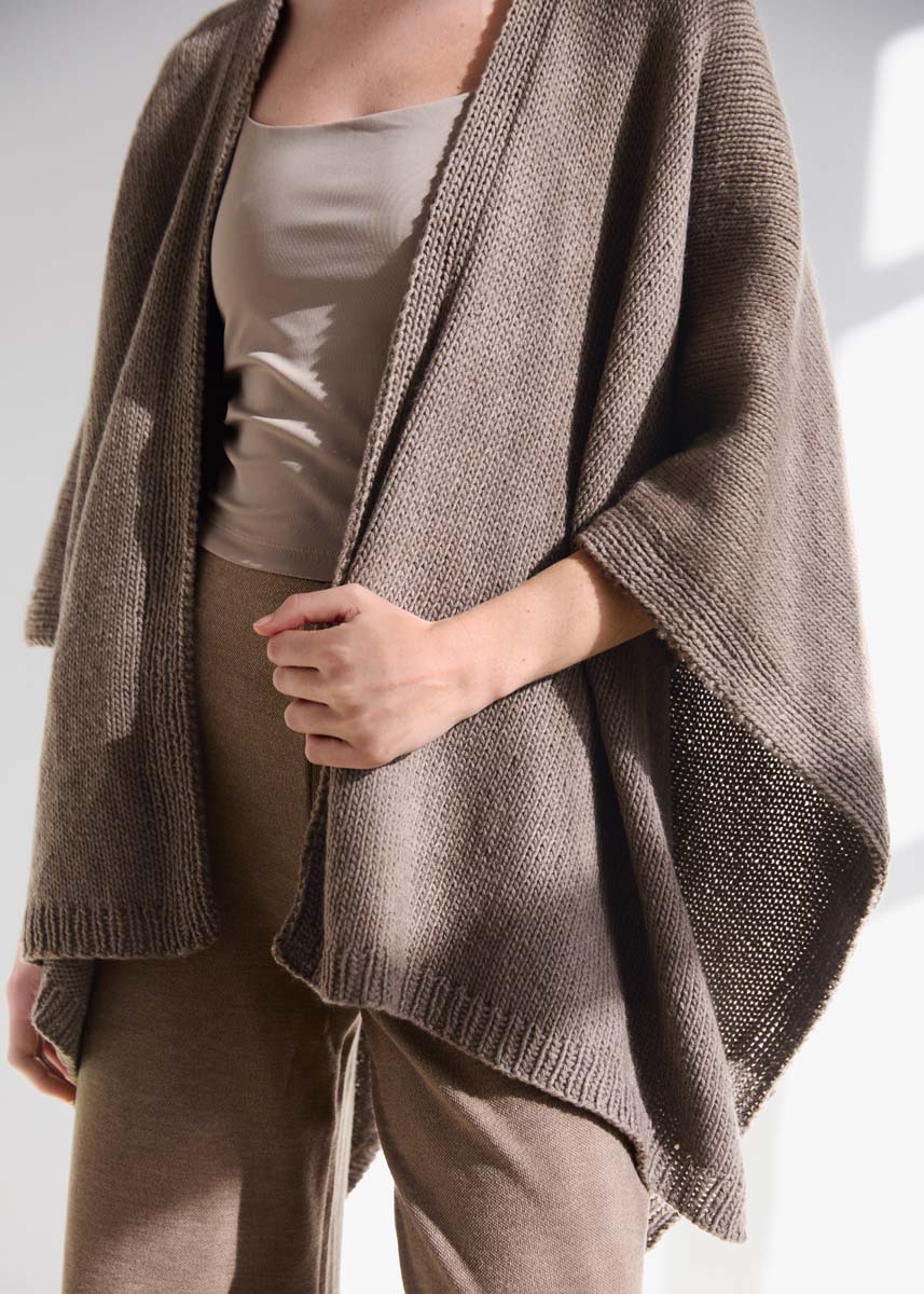 Lana Grossa Cashmere Kiss (70% Schurwolle (Merino superfein), 30% Kaschmir, Lauflänge 70 m/25 g), 600 (650) g Taupe (Fb. 103); je 1 Rundstricknadel Nr. 5,5 und 6, 80 cm lang.