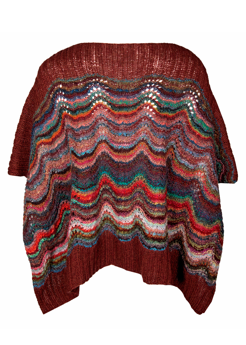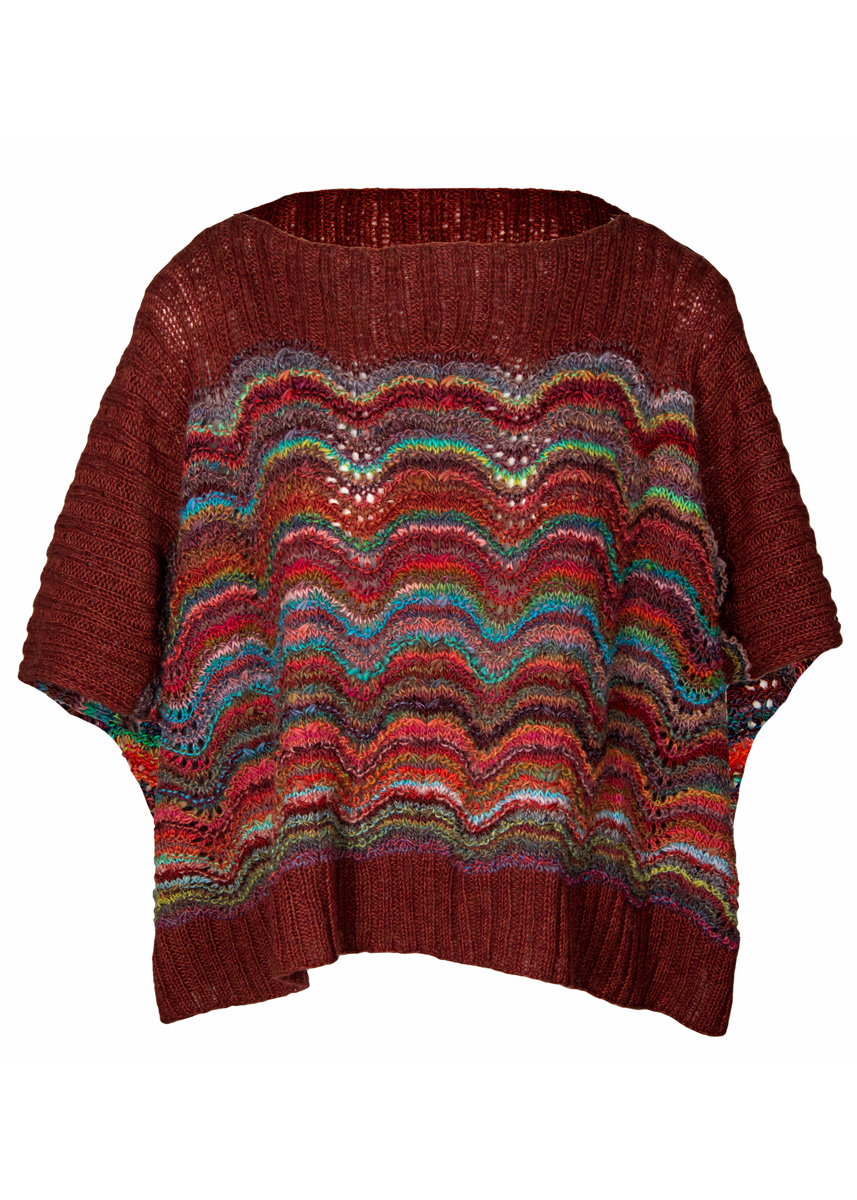 Lana Grossa Colorissimo (100% Schurwolle Merino extrafein, Lauflänge 300 m/100 g), 400 (500) g Rot/Petrol/Grün/Rosa/Hellgrün/Bordeaux (Fb 3) und Ecopuno (72% Baumwolle, 17% Schurwolle Merino, 11% Baby Alpaca, Lauflänge 215 m/50 g), 150 g Braunrot (Fb 31); Stricknadeln Nr. 4,5, 1 Zopfnadel.