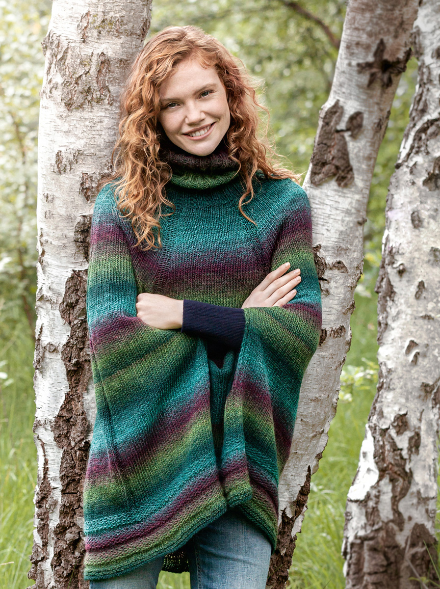 Lana Grossa Gomitolo Versione (60% Schurwolle, 40% Polyacryl, Lauflänge 700 m/200 g), 400 g Bordeaux/Türkis/ Schwarz-/Gelbgrün (Fb 416); je 1 Rundstricknadel Nr. 5, 40, 60, 80 und 120 cm lang und 1 Rundstricknadel Nr. 4,5, 40 cm lang.