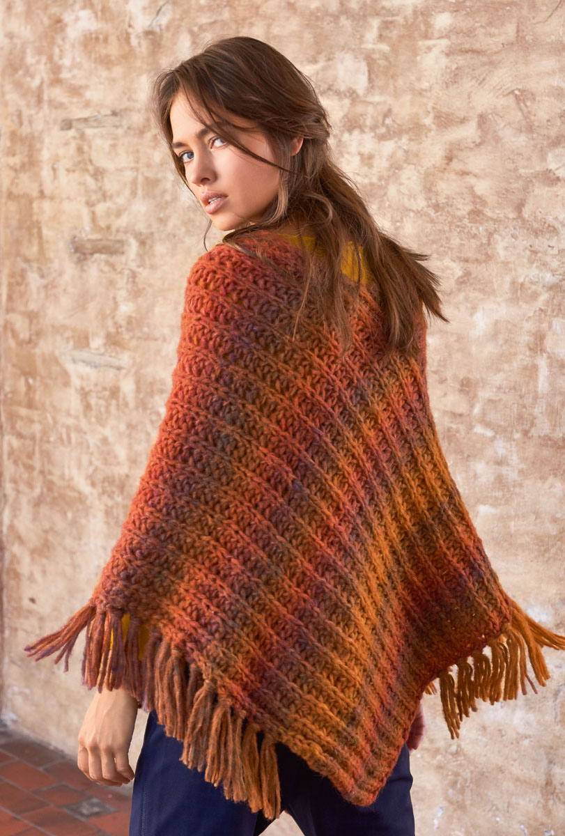 GÄBE ES DEN PONCHO NICHT, wir müssten ihn erfinden! Ideal für die Übergangszeit und eine perfekte Alternative zum Mantel. Unser neues Trendteil stricken wir in einem Farbverlaufgarn und im Halbpatent mit einem auffällig breiten Zopf. Fransen einknüpfen - einfach wow!