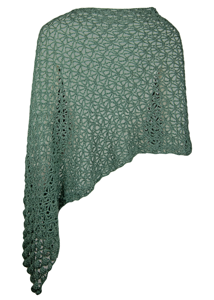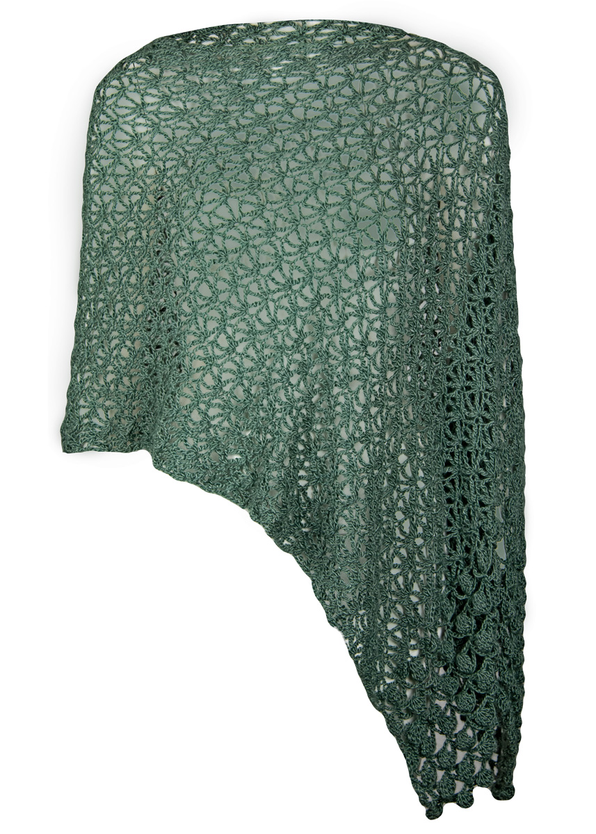 Lana Grossa Lace Seta Mulberry (35% Seide (Maulbeer), 35% Baby Alpaca, 30% Schurwolle Merino extrafein, Lauflänge 175 m/50 g), 300 (350) g Dunkelgrün (Fb 19); 1 Häkelnadel Nr. 4.