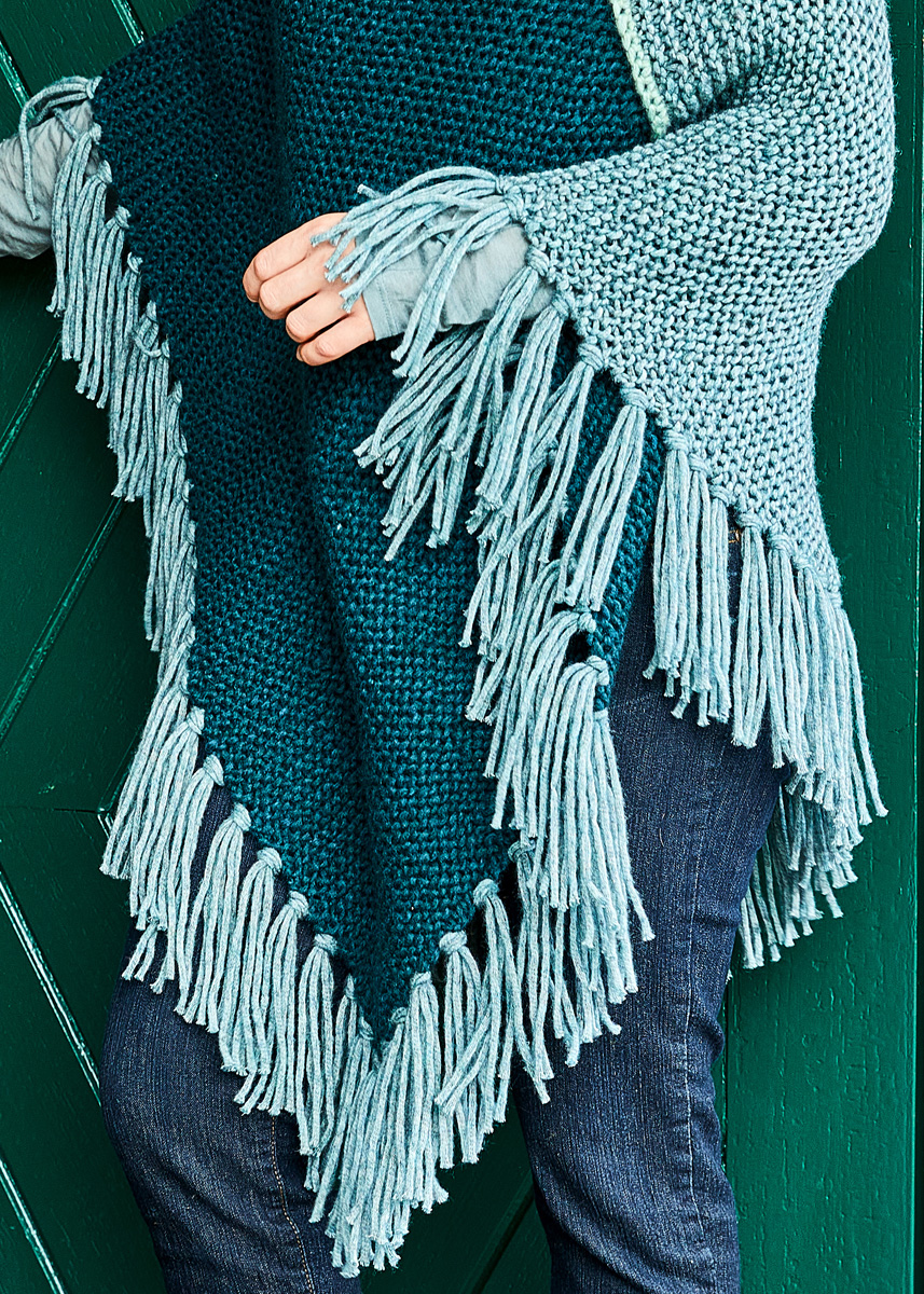 Lana Grossa-Qualität „Landlust Winterwolle“ (50% Schurwolle Merino, 35% Baumwolle, 15% Yak, LL ca. 70 m/50 g), 350 g in Petrol Meliert (Fb 13), 250 g in Dunkelpetrol Meliert (Fb 18) und 50 g in Mint Meliert (Fb 17); Stricknadeln Nr. 9, 1 Häkelnadel Nr. 7.