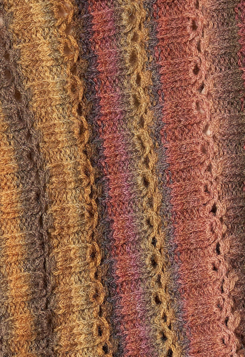 Lana Grossa-Qualität „Tinto” (45 % (Baby) Alpaka, 40 % Schurwolle (Merino), 15 % Nylon, LL = ca. 190 m/50 g): ca. 350 (400) g Schoko-/Nussbraun/Senf/Graugrün/Beere/Aubergine/Pflaume (Fb. 8); Stricknadeln Nr. 4,5, 1 Wollhäkelnadel Nr. 5 zum Einziehen der Fransen.
