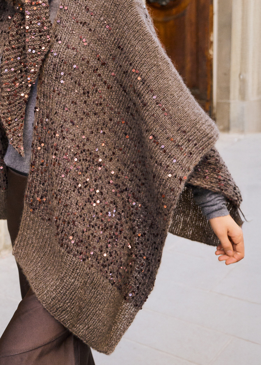 Lana Grossa-Qualität „Superkid Seta“ (65 % Mohair (Superkid), 35 % Seide, LL = ca 100 m/25 g): ca 275 g Graubraun (Fb 26); Lana Grossa-Qualität „Cosmo“ (100 % Baumwolle plus Pailletten, LL = ca 260 m/100 g): 200 g Mokka (Fb 6); Stricknadeln Nr 6.