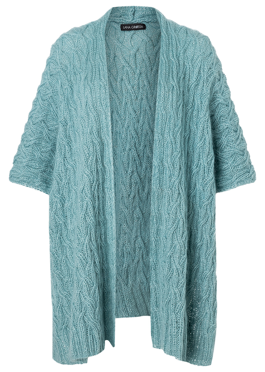 Garn 1: Lana Grossa Ecopuno (72% Baumwolle, 17% Schurwolle (Merino), 11% Alpaka (Baby), Lauflänge 215 m / 50 g): ca. 300 (450) g, Minttürkis (Fb. 44); Garn 2: Lana Grossa Silkhair (70% Mohair (Superkid), 30% Seide, Lauflänge 210 m / 25 g): ca. 150 (225) g, Helltürkis (Fb. 82); Stricknadeln Nr. 5,5 - 6; 2 Maschenraffer für Kragenblende; separate Stricknadel oder Seil für Vorderteil; Wollnadel; Schere und einige Maschenmarkierer.