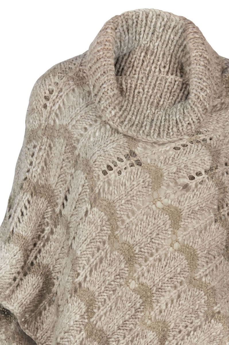 Lana Grossa „Yak Merino“ (28 % Alpaca, 30 % Schurwolle, 20 % Yak, 22 % Polyamid, LL = 110 m/50 g); 200 g Grège (Fb. 10); „Splendid“ (72 % Mohair, 21 % Nylon 7 % Lurex, Lauflänge 167 m/25 g), 50 g Hellbraun/Gold (Fb. 10); Stricknadeln Nr. 7; Rundstricknadel Nr. 8, 40 cm lang.