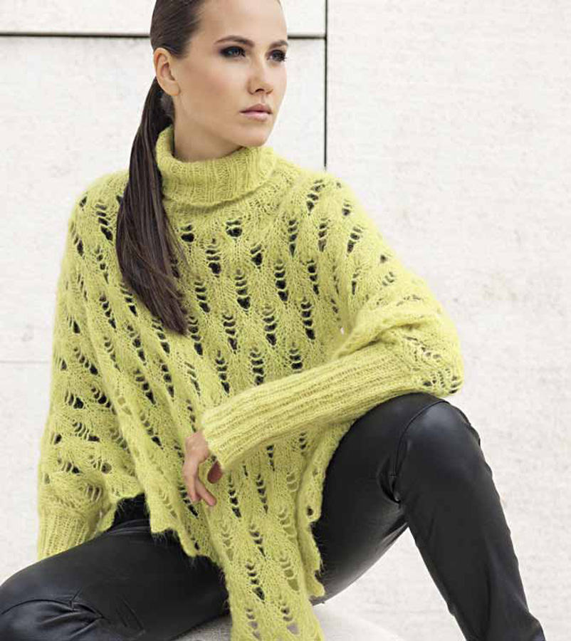 Wem ein klassischer Rolli zu langweilig ist, hier die Alternative: ein moderner Mix aus Poncho und Rolli. Dekorative Akzente setzen Farbe, Lochmuster und Flauschgarn. Perfekter Jackenersatz für die Übergangszeit.