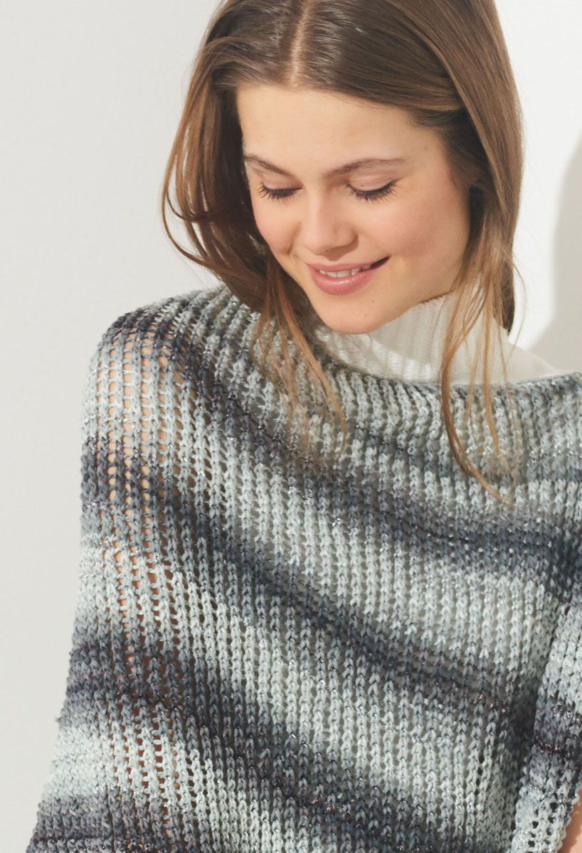 Lana Grossa Allegro Dégradé (58% Viskose, 42 % Baumwolle, Lauflänge 230 m/100 g), 400 (500 – 500) g Natur/Grège/Braungrau/Khaki/Mokka (Fb 209); 1 Rundstricknadel Nr. 6, 80 cm lang.