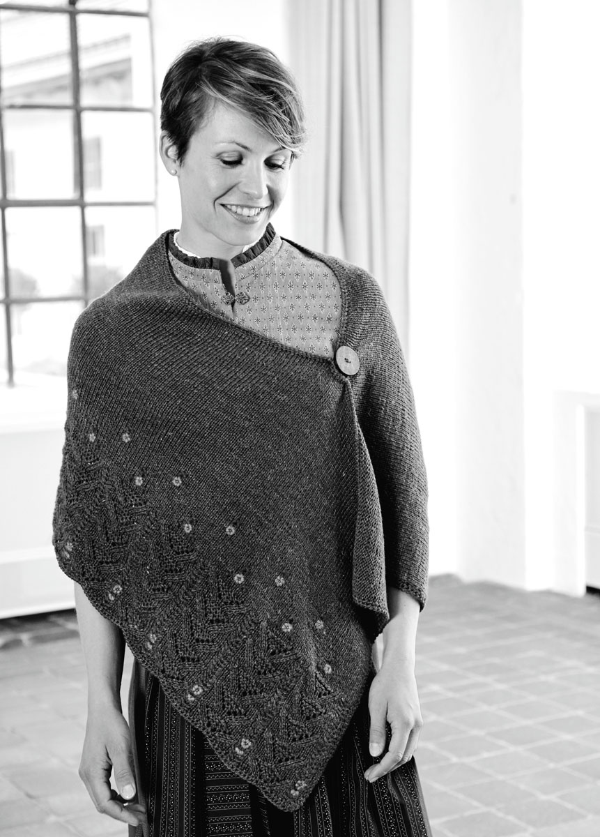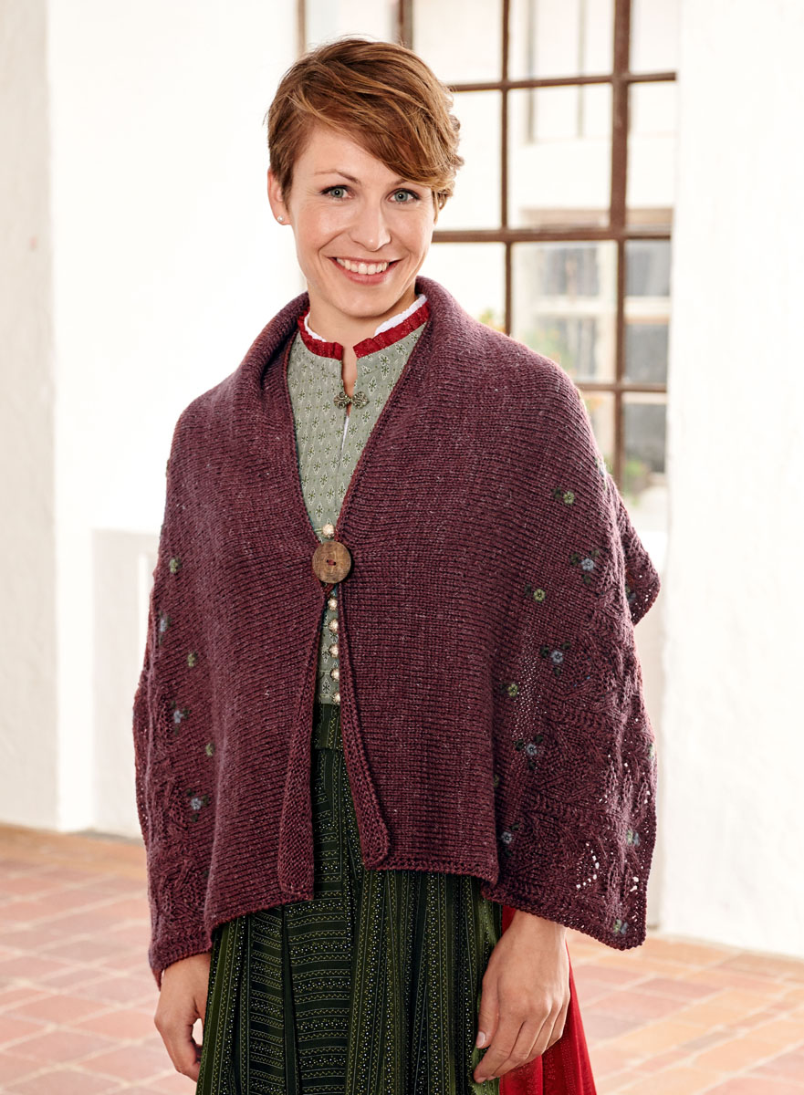 Lana Grossa Slow Wool Lino (85 % Schurwolle, 15 % Leinen, Lauflänge 400 m/100 g), 400 (500 – 500) g Burgund (Fb 15) und Silkhair (70 % Mohair, 30 % Seide, Lauflänge 210 m/25 g); 25 g Khaki (Fb 60), 25 g Dunkeloliv (Fb 111) und 25 g Taupe (Fb 35); Stricknadeln Nr. 4,5, Häkelnadel Nr. 3,5; 0 g TOHO Rocailles-Glasperlen von Emeraldis, Fb Nickel, mit 2,1 mm Durchmesser; 1 Knopf von Union Knopf, Art. Nr. 44840, Fb. 20 mit 40 mm Durchmesser.