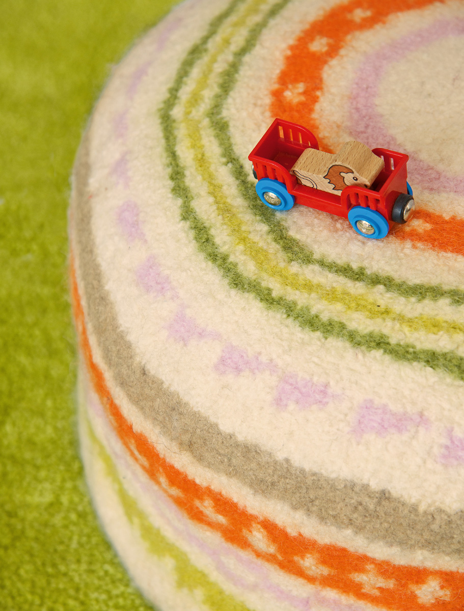 Passend zum Teppich haben wir uns bei dem niedlichen Pouf in Grüntönen für einen knallig orangen Akzent entschieden. Aber auch auf dunklem Hintergrund, in Grauschattierungen oder Ton-in-Ton in Rosa, Pink, Lila und leuchtendem Rot ist er sicher eine lohnende Strickinvestition.