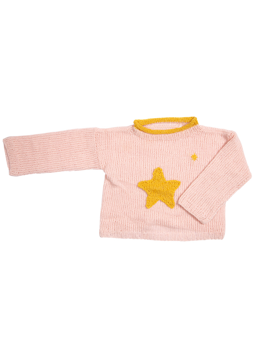 Lana Grossa Allora (76 % Baumwolle, 14 % Schurwolle (Merino superfine), 10 % (Baby) Alpaka, Lauflänge 300 m/50 g) 50 (50/100) g Pastellrosa (Fb 15) und 50 g Gelb (Fb 1); Stricknadeln Nr. 3,5, eine 40 cm lange Rundstricknadel Nr. 3,5, Häkelnadel Nr. 3.