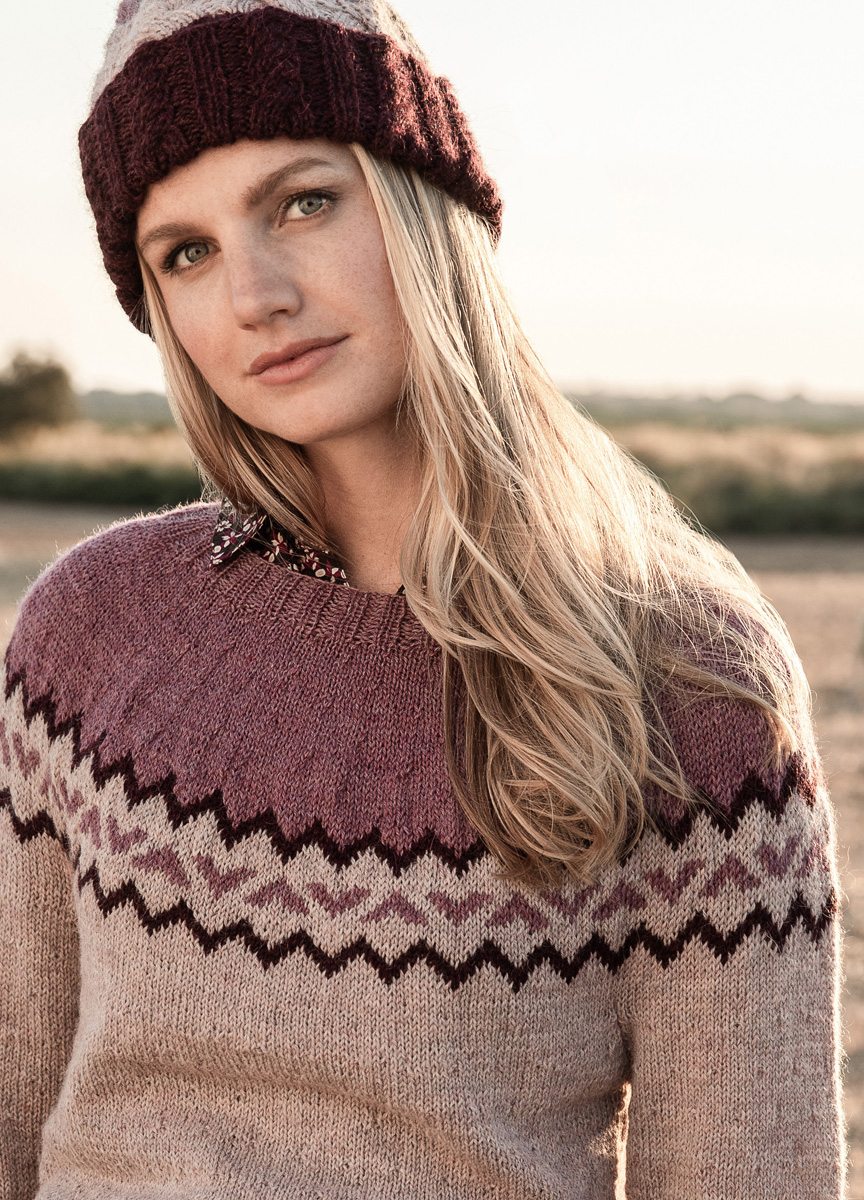 Lana Grossa Alpaca Peru 200 (100 % Alpaka, Lauflänge 200 m/50 g); 200 (250 – 300) g Rosenholz (Fb 201), 100 (100 – 150) g Graurot (Fb 202) und 50 (50 – 100) g Dunkelrot (Fb 205); Stricknadeln Nr. 3,5, je eine 40, 60 und 80 cm lange Rundstricknadel Nr. 3,5
