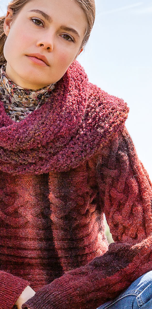 Weil Vorder- und Rückteil jeweils am Stück gestrickt werden, kommen Farben und Muster hier besonders schön zur Geltung. Dazu gibt’s den passenden Loop-Schal.
