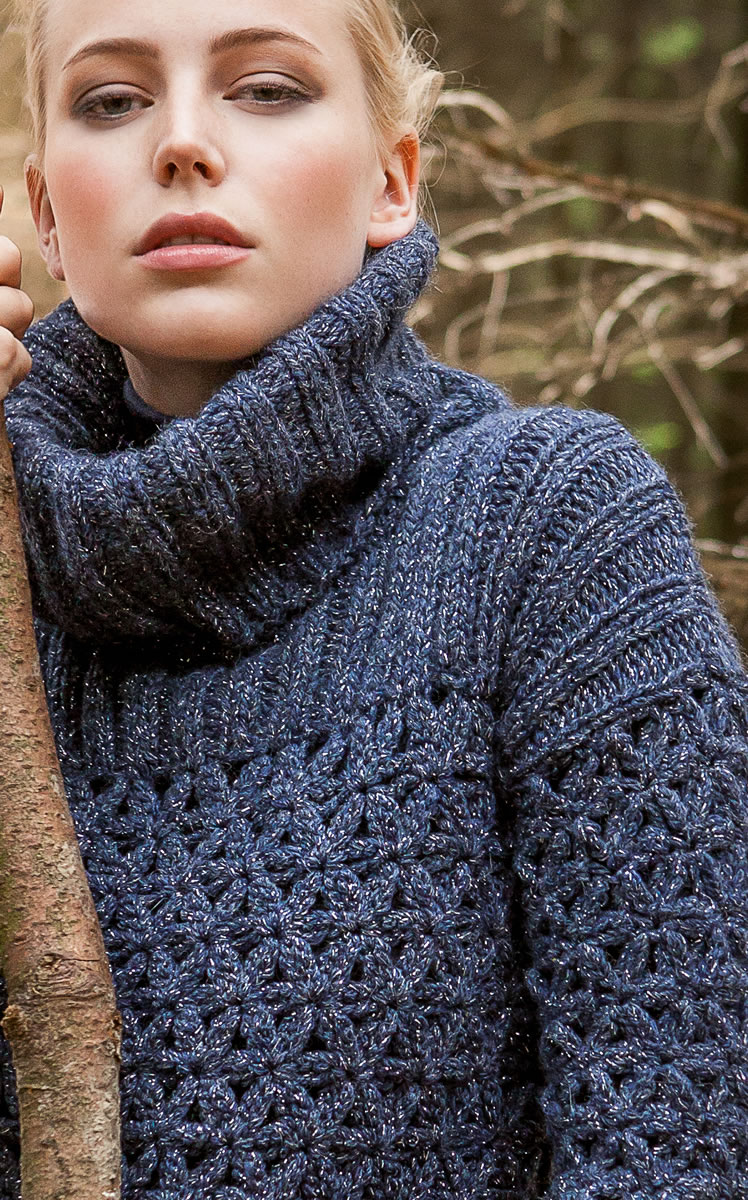 Warmes Jeansblau und Silber-Lurex: Dieser Rolli bringt Outfit UND Teint zum Strahlen.