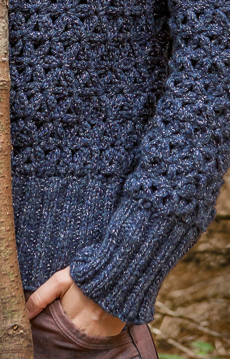 Lana Grossa Alta Moda Superbaby Stella (67 % Schurwolle, 30 % Alpaka, 3 % Polyamid, Lauflänge 60 m/50 g) 500 (550/600) g Marine/Silber (Fb 207); Stricknadeln Nr. 8, eine 40 cm lange Rundstricknadel Nr. 7, Häkelnadel Nr. 7