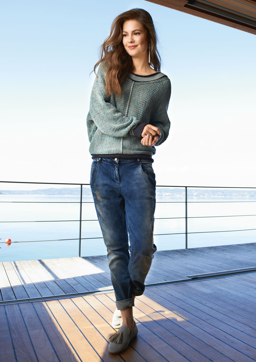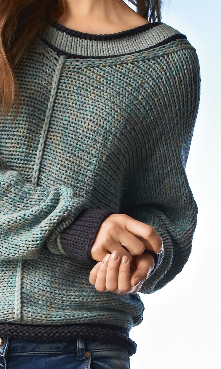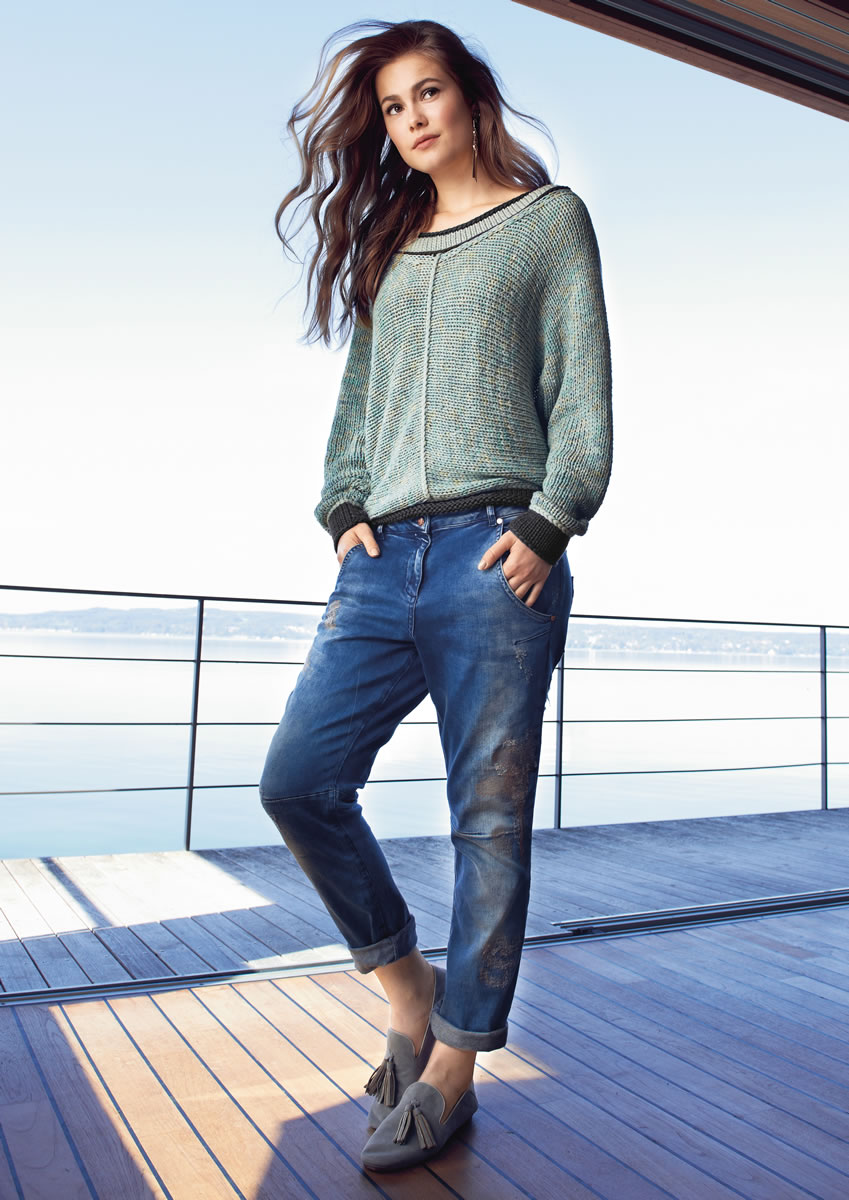 Lana Grossa-Qualität „California Print” (85 % Baumwolle, 15 % Seide, LL = ca. 100 m/50 g): ca. 450 (500 – 550) g Graugrün/Mint (Fb. 302) und Lana Grossa-Qualität „Cashsilk” (40 % Polyamid, 30 % Bambus, 15 % Kaschmir, 15 % Seide, LL = ca. 75 m/50 g): ca. 50 (75 – 75) g Graugrün (Fb. 37) und ca. 100 (150 – 150) g Mokka (Fb. 11); Stricknadeln Nr. 8 und 9, je 1 Rundstricknadel Nr. 8, 60 und 80 cm lang.