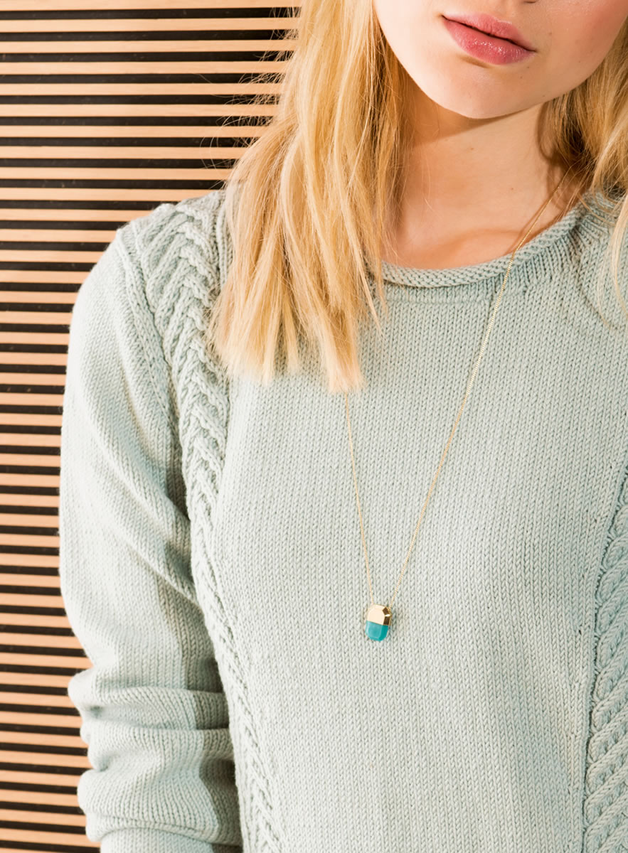 Aranmuster sind Kult! Ja, dieses traditionelle Design gibt dem schlichten Pulli das gewisse Etwas. Quer verlaufend, in einem frischen Mintton gestrickt, und schon ist er etwas ganz Besonderes!