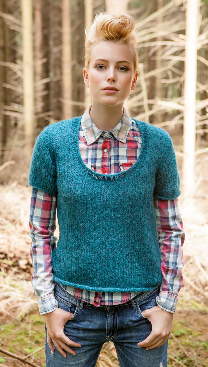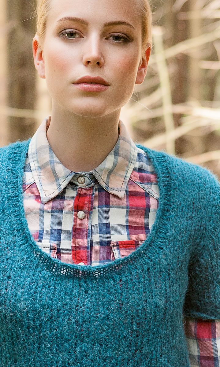 Lana Grossa Dito (44 % Polyamid, 28 % Alpaka, 28 % Mohair, Lauflänge 175 m/50 g) 150 (200/250) g Petrol (Fb 5); Stricknadeln Nr. 7, eine 40 cm lange Rundstricknadel Nr. 6.