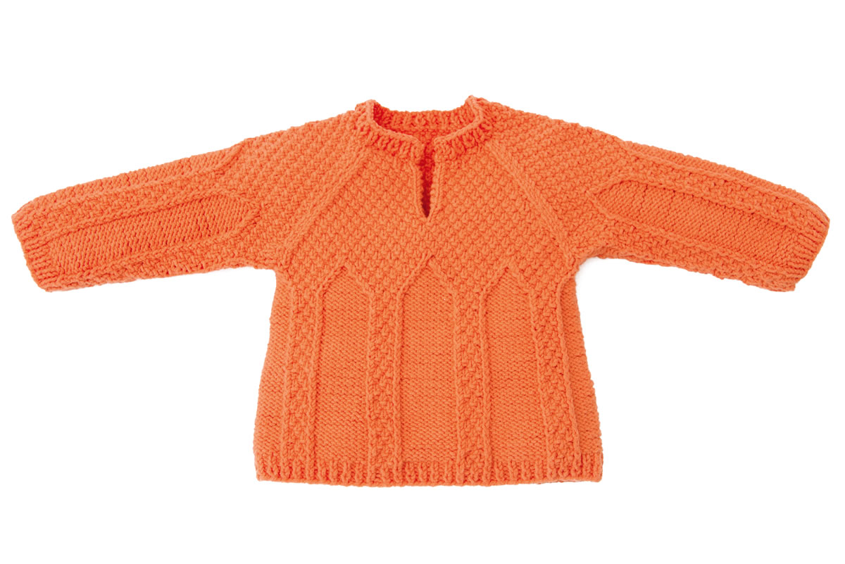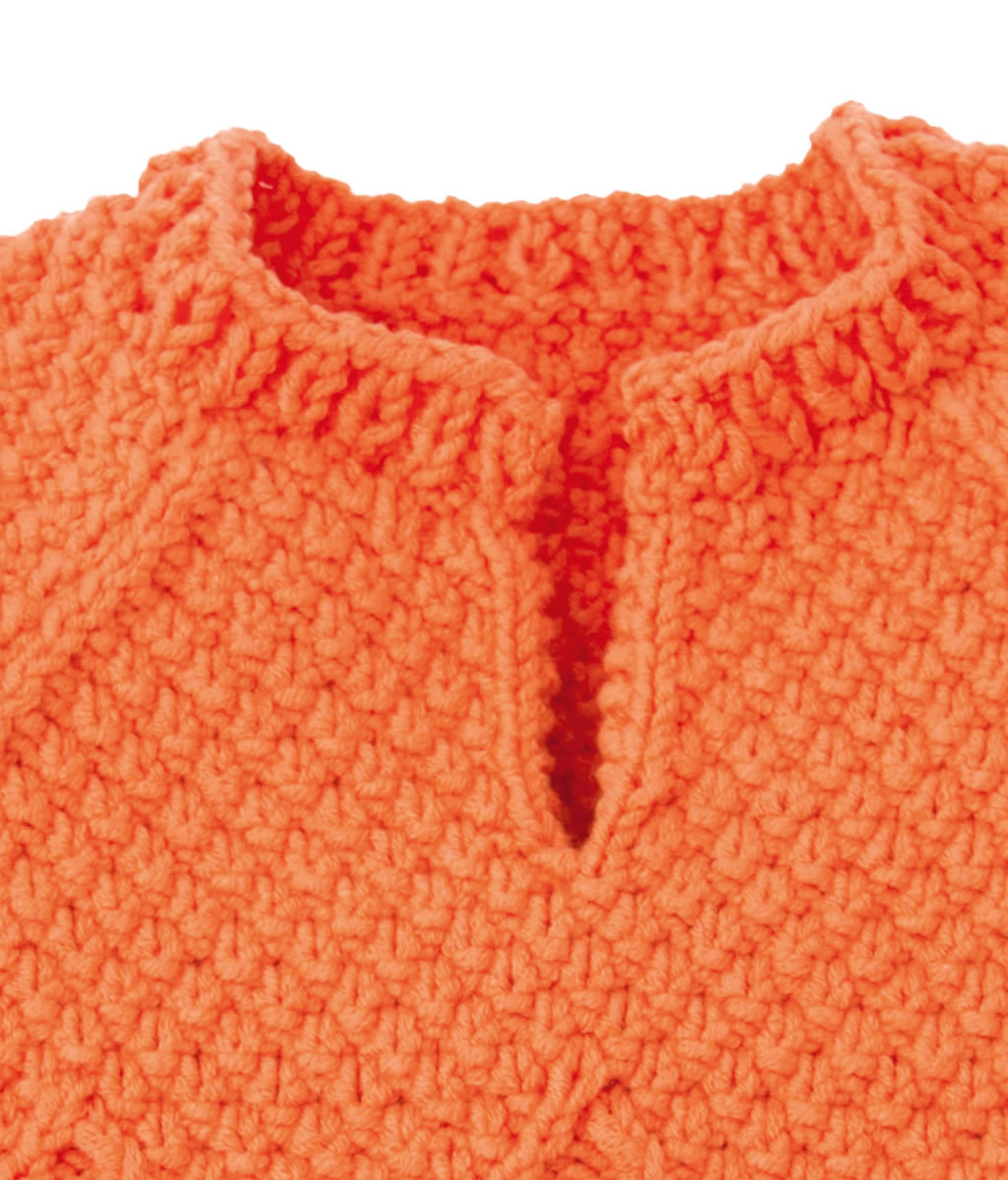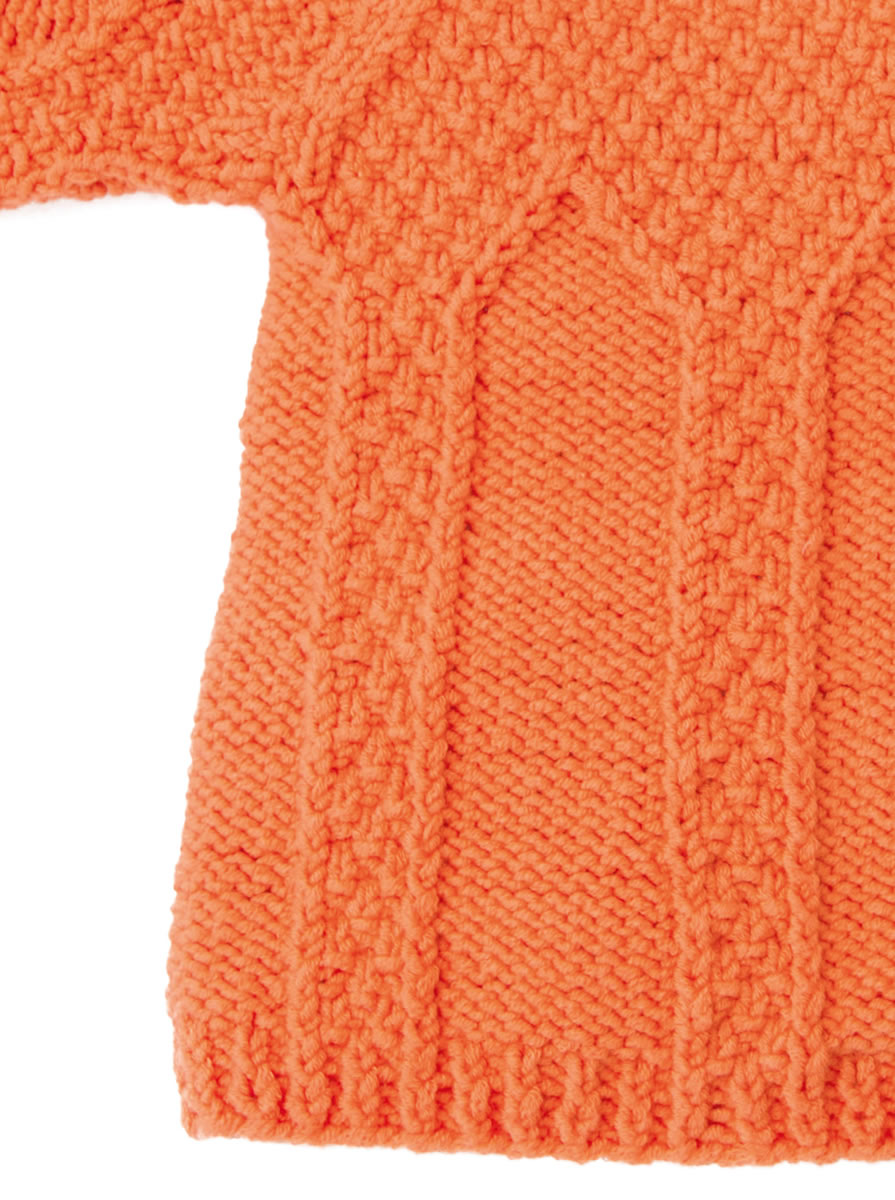 Lana Grossa Qualität „Elastico Big“, 96 % Baumwolle, 4 % Polyester, Lauflänge 105 m/50 g; 200 (250/250) g Mandarin (Fb 14); Stricknadeln Nr. 4,5, eine 40 cm lange Rundstricknadel Nr. 4,5.