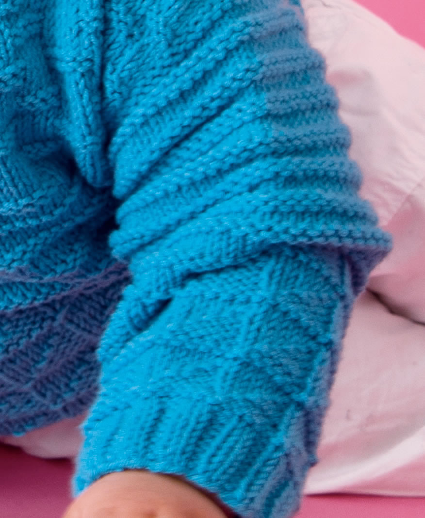 Lana Grossa Qualität „Elastico“, 96 % Baumwolle, 4 % Polyester, Lauflänge 160 m/50 g; ca. 150 g Azurblau (Fb 115); Stricknadeln Nr. 4, eine 40 cm lange Rundstricknadel Nr. 4.