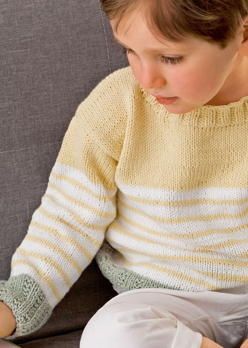 Vanille-Eis oder -Pudding schmeckt echt lecker und als Farbton wirkt er dazu noch richtig süß! Begrüßen Sie also den „süßen“ Neuankömmling mit einer Garnitur aus Jacke, Hose, Mütze und Strümpfen – schön für kleine Jungs. Mädchenmamis freuen sind über die vanillegelbe Tunika mit zarter Ajourbordüre an den Saumkanten und die gemütliche Hose. Und die größeren Geschwister über einen lässig gestreiften Baumwollpulli. Mmmm!