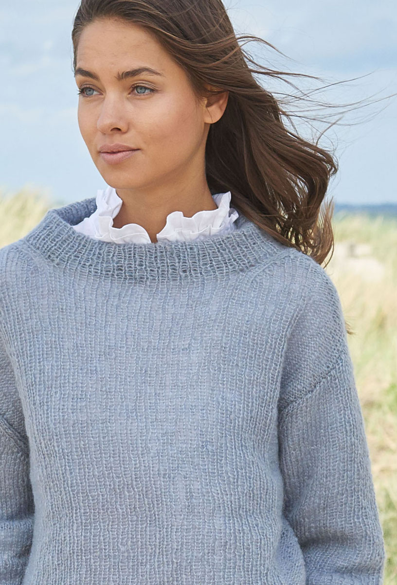 Lana Grossa-Qualität „Emozione” (43 % Schurwolle (Merino), 22 % Seide, 22 % Mohair (Superkid), 13 % Yak, LL = ca. 150 m/25 g): ca. 175 (200 – 225) g Rauchblau (Fb. 13); Stricknadeln Nr. 4, je 1 Rundstricknadel Nr. 3 und 4, 50 cm lang.