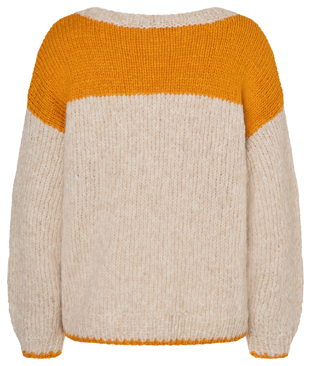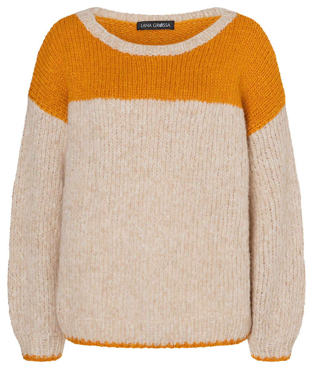 Lana Grossa-Qualität „Alpaca Moda” (74 % (Baby) Alpaka, 13 % Schurwolle (Merino), 13 % Polyamid, LL = ca. 135 m/50 g): ca. 250 (300 – 350) g Beige (Fb. 2) und Lana Grossa-Qualität „Baby Light” (62 % (Baby) Alpaka, 23 % Schurwolle (Merino), 15 % Polyamid, LL = ca. 180 m/50 g): ca. 100 (100 – 150) g Cognac (Fb. 2); Stricknadeln Nr. 5,5 und 6,5, 1 Rundstricknadel Nr. 5,5, 50 cm lang.