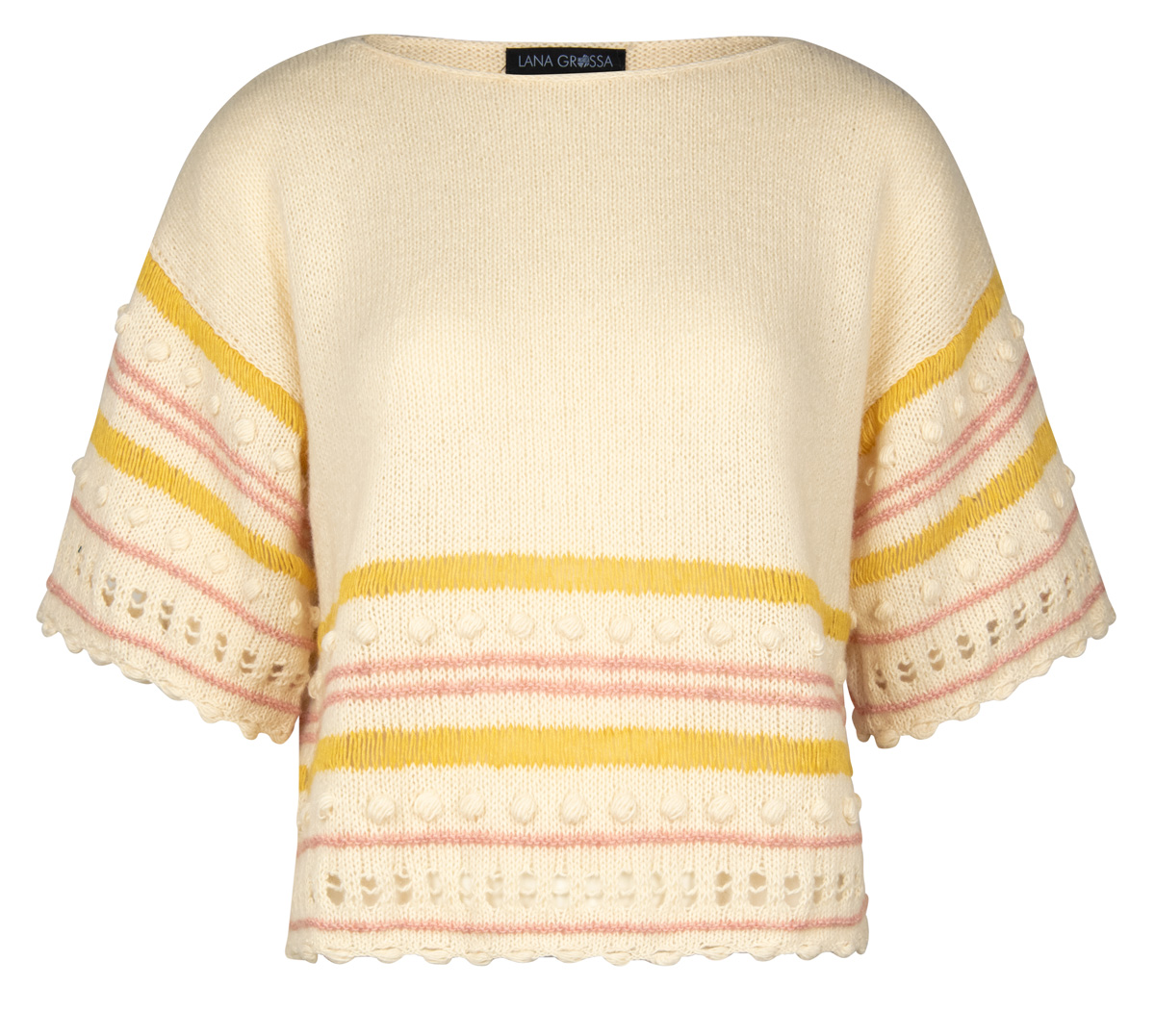 Lana Grossa-Qualität „Ecopuno” (72 % Baumwolle, 17 % Schurwolle (Merino), 11 % (Baby) Alpaka, LL = ca. 215 m/50 g): ca. 250 (300) g Ecru (Fb. 46), je ca. 50 g Pfirsich (Fb. 7) und Hellgelb (Fb. 52); Stricknadeln Nr. 4, 1 Wollhäkelnadel Nr. 4.