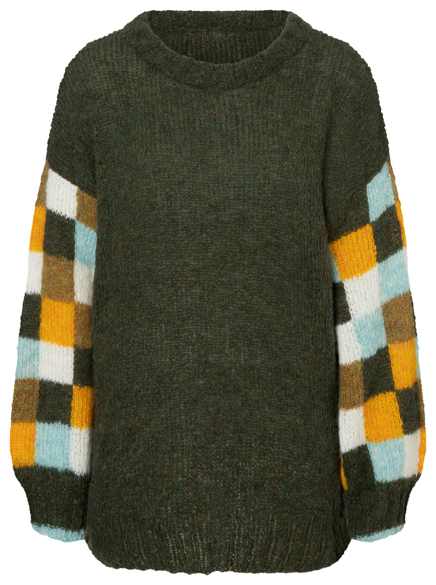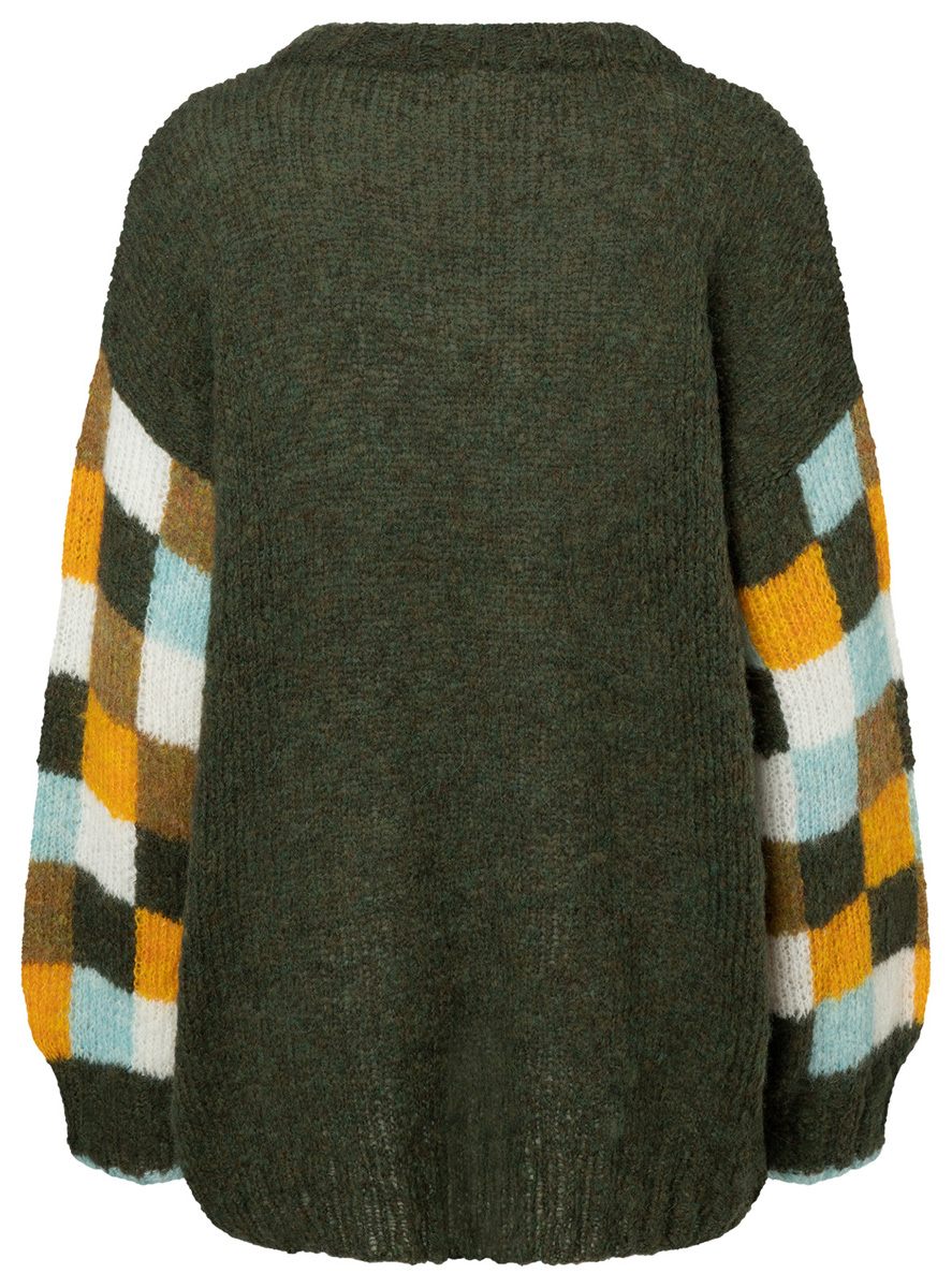 Einfach effektvoll: Beim lässigen, moosgrünen Sweater erleichtern die kerzengeraden Ärmel das Kästchenstricken mit 7 Knäueln.