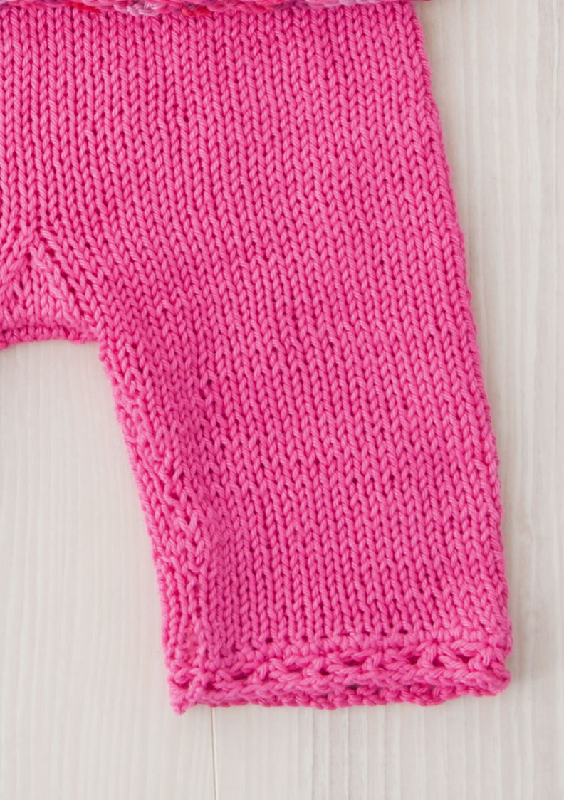 Lana Grossa Qualität „Cotone“, 100 % Baumwolle, Lauflänge 125 m/50 g; ca. 100 g Pink (Fb 3) und „Cotone Print“, 100 % Baumwolle, Lauflänge 125 m/50 g; ca. 100 g Pink Color (Fb 307); Stricknadeln Nr. 4, eine ca. 40 cm lange Rundstricknadel Nr. 4, eine Häkelnadel Nr. 3; 2 Knöpfe und ein Gummiband.